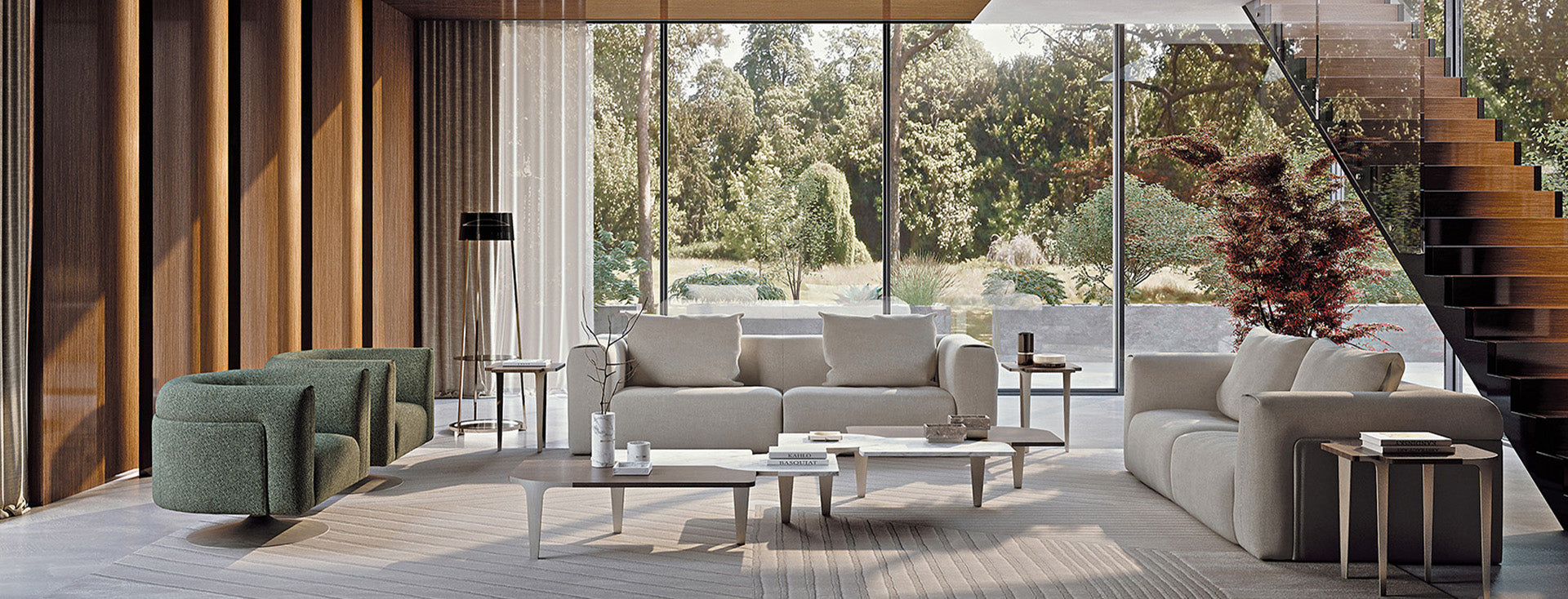 Panels that frame the back part characterize the sofas from Soul collection. The precious leather inserts enrich the edges of the armrests, they pop-out from between the folds of the internal corners of the backrest, as it to highlight its depth.