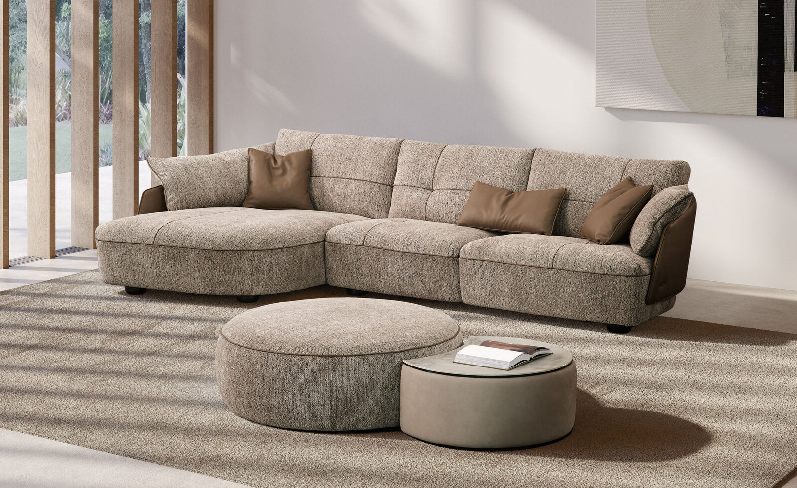 The outer frame elegantly clasps the backrest cushions and seat. Designed to create in-line and corner compositions with chaise lounges and arm chairs, this immensely modular collection is traversed by a golden thread - its curvaceous organic beauty.