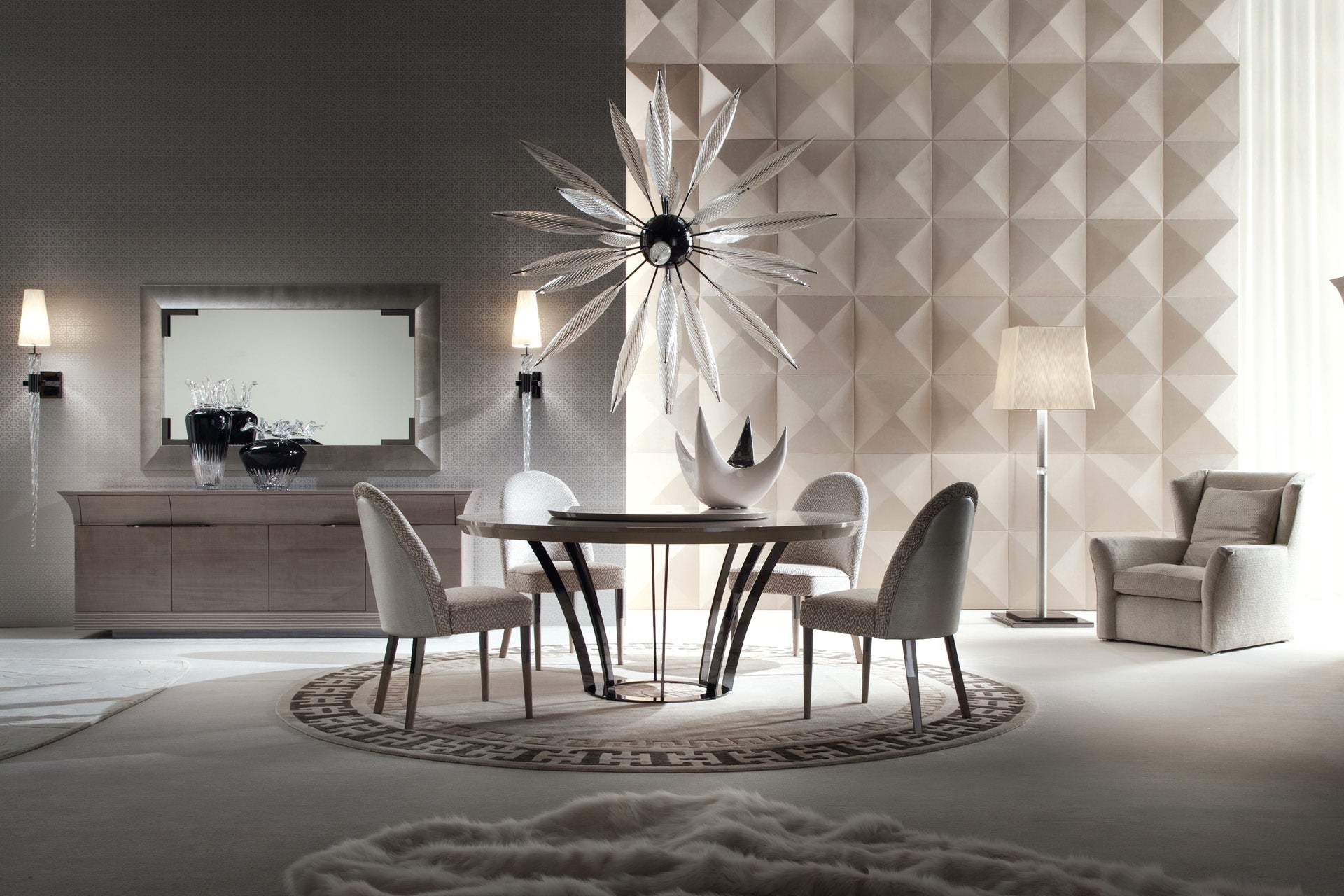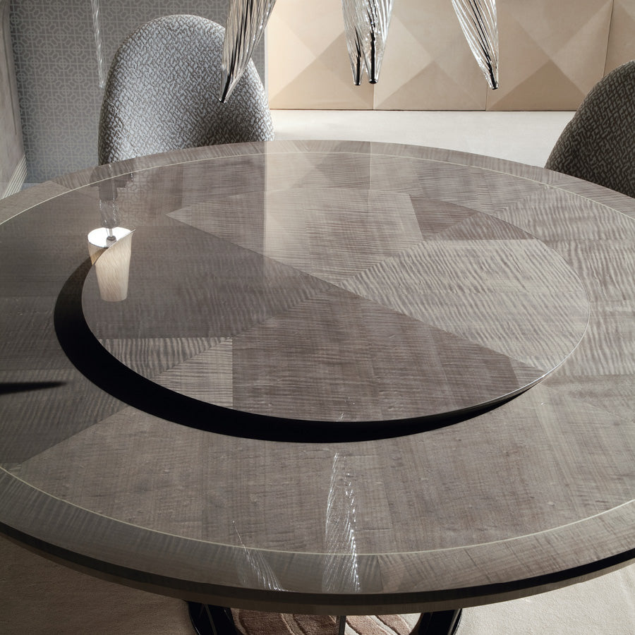 Part of the Alchemy Collection, this Italian-made luxury dining table is defined by sophisticated elegance and architectural precision. The design features carefully selected materials, combining exotic Tiger African Sycamore timber with subtle light grey hues to create a refined, contemporary aesthetic.