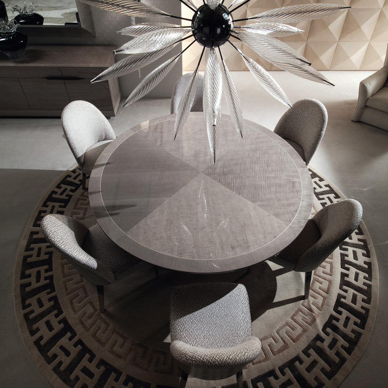 Dramatic Dark Storm Grey chrome details provide a striking contrast, enhancing the table’s handles and intricate timber inlay work. A white maple inlay frames the design, adding depth, balance, and an elevated sense of prestige, all hallmarks of Italian craftsmanship.