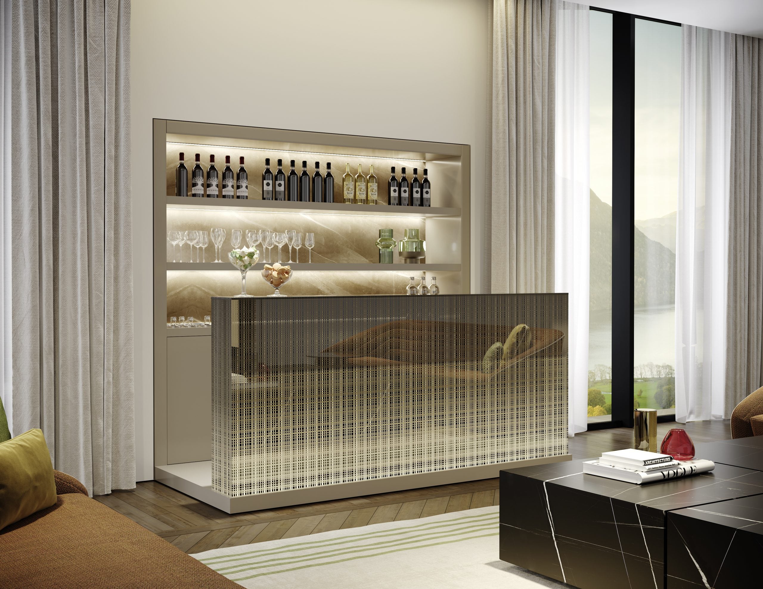 This Bar is available in shiny lacquered colour with your choice of colour OR smoked mirror glass, with standard push pull opening doors OR with handles in clear Murano glass. Optional engraved glass doors with round crystal handles.