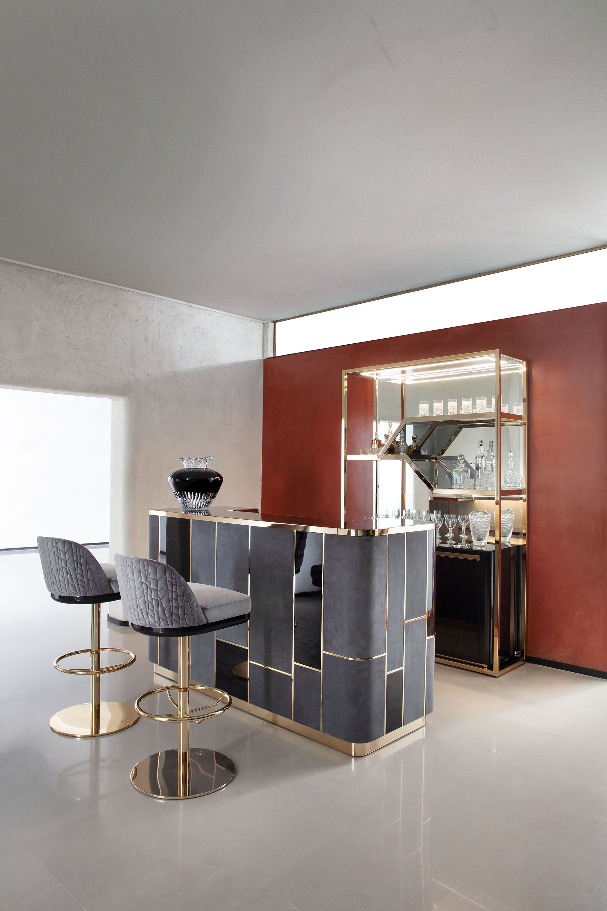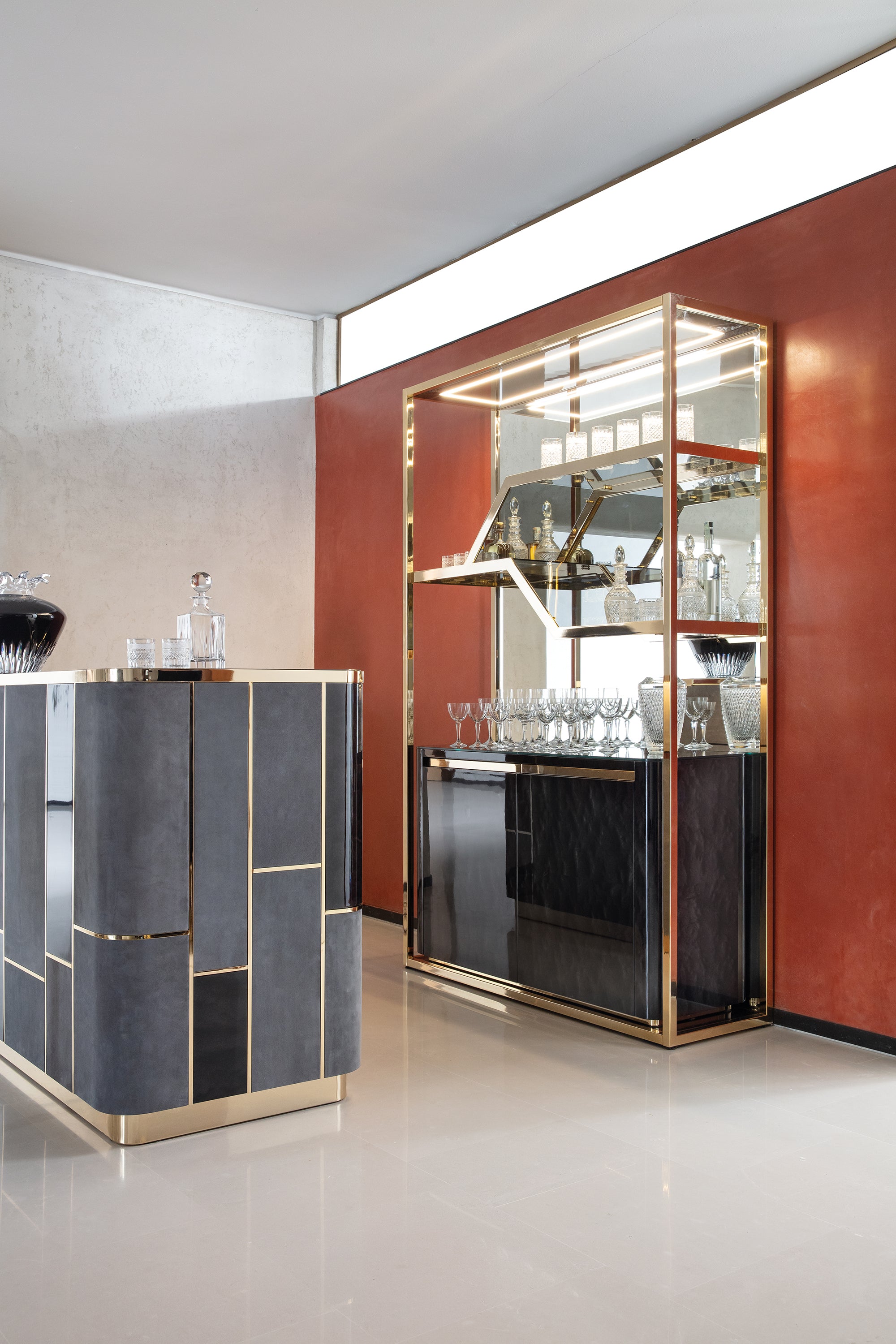 Bar cabinet in Black Bubinga burl veneer with high gloss polyester finish with back in mirror. 2 wooden doors with 2 glass adjustable shelves.Top part with led light.Structure, base and handles in light gold chrome stainless steel. 5 smoked tempered glass shelves.