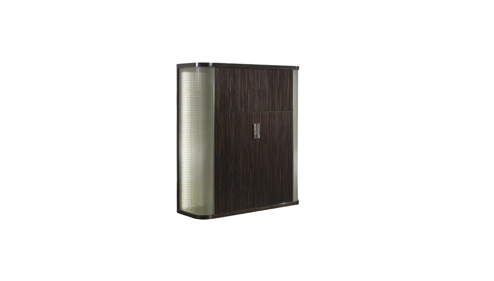 Includes two doors with handles in antique dark brass plus one folding door with push - pull opening and LED lighting activated when opening. Curved sides crafted with Fluted glass and bronze (or brass) Mesh decorations. Details in antiqued dark brass. Internal back in mirror glass and transparent glass internal shelves.