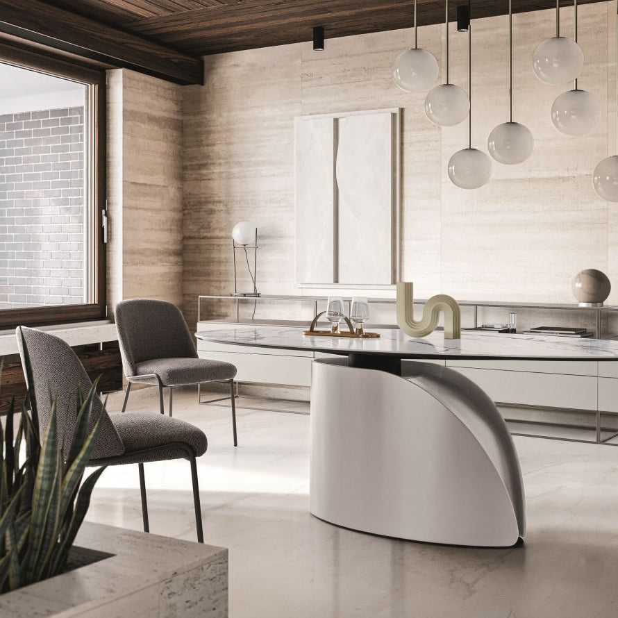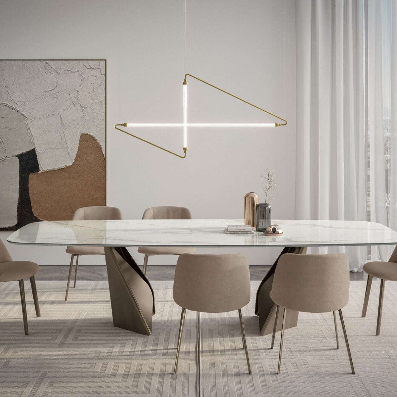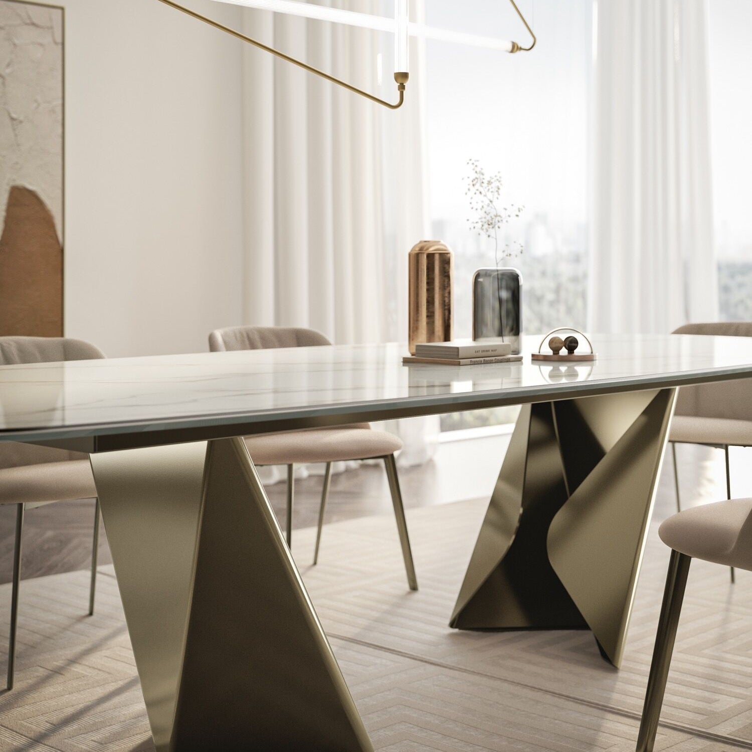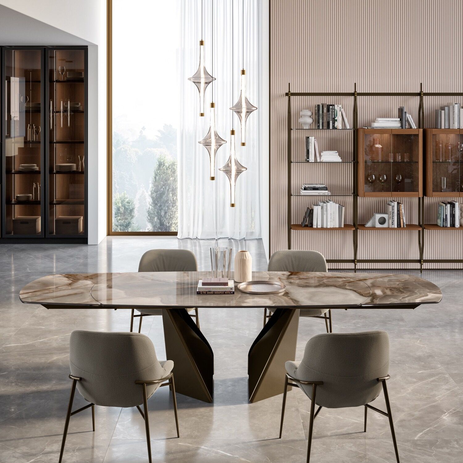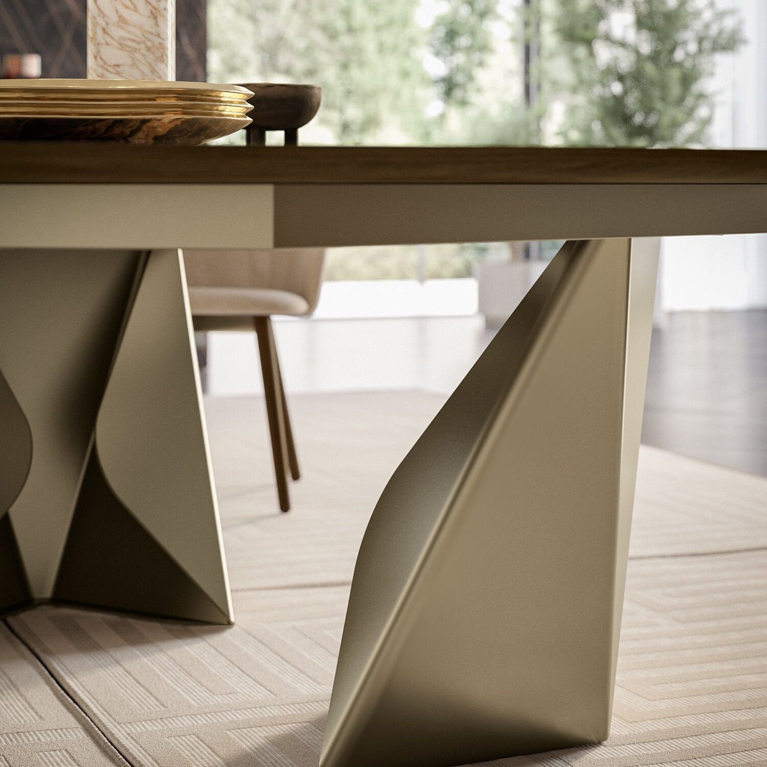 The Kimono Table will create a statement in any Dining space. Options of a Rectangular fixed table, a rectangular extendable table, barrel fixed table or a barrel extendable table with lacquered steel structure. Tabletop available in Super Ceramic, Super Marble, veneered wood, solid wood, glossy extra-white glass, and scratch-resistant velvet glass.