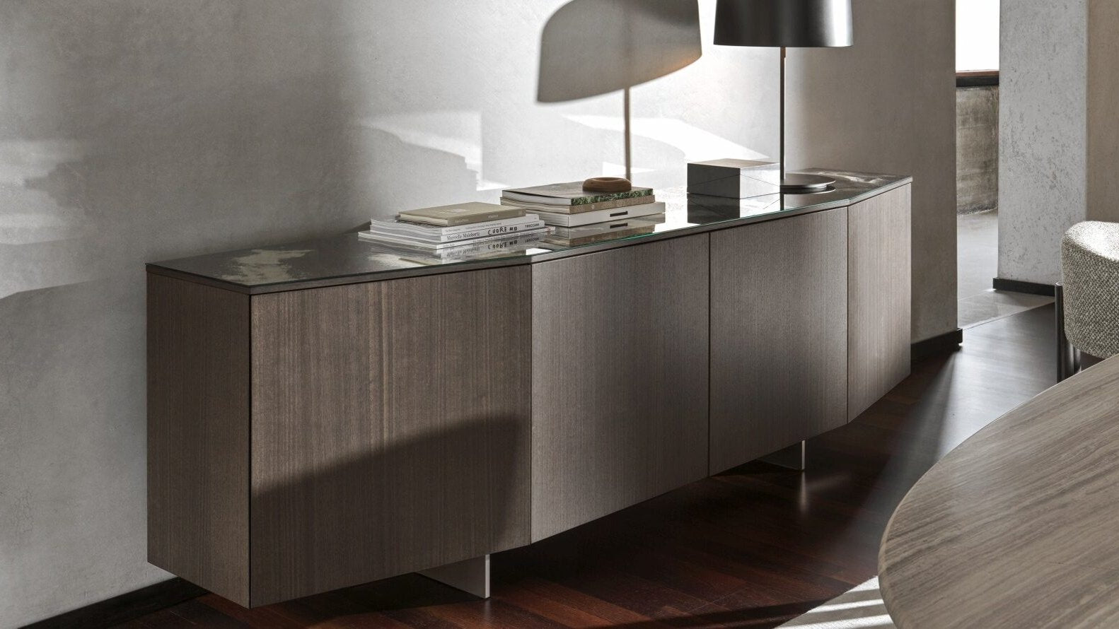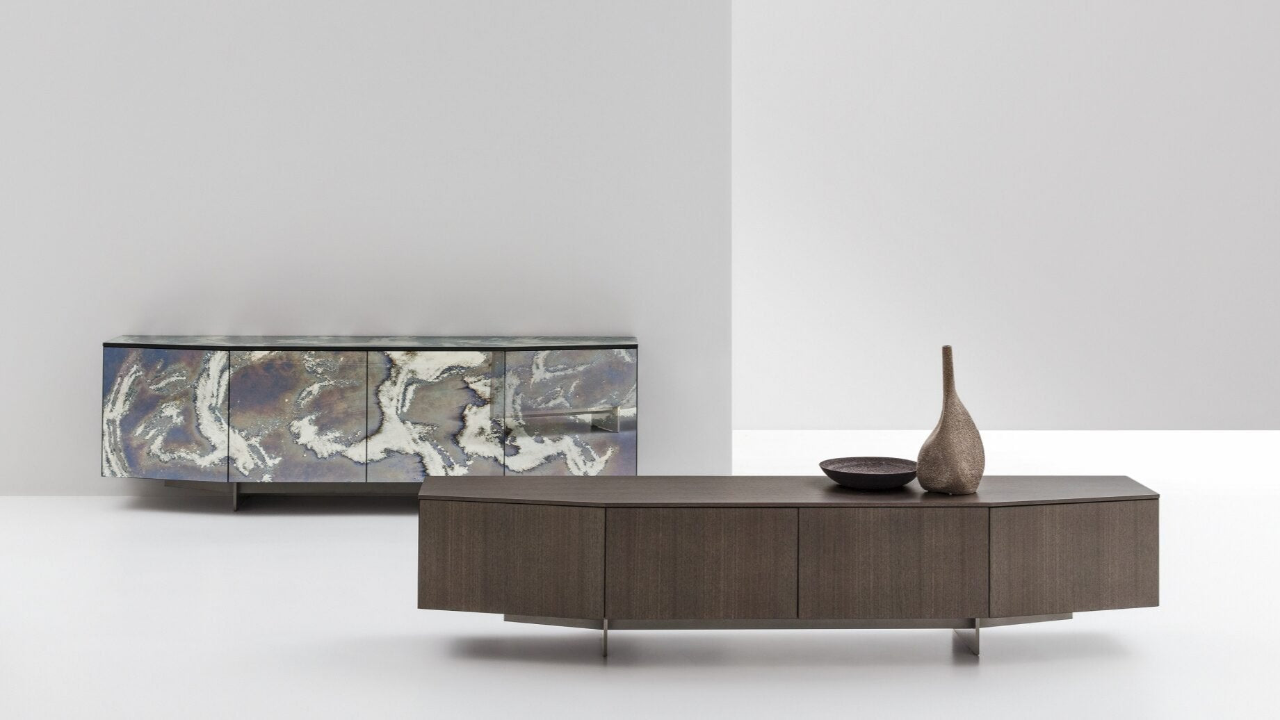A small architectural feature plays the starring role in the home. With its sculptural shape, in both the high and low version, the Angle sideboard is distinguished by a tapered design and a reduced depth. The frame, body, top and doors can be ordered with customised materials and finishes including wood and oxide mirror.