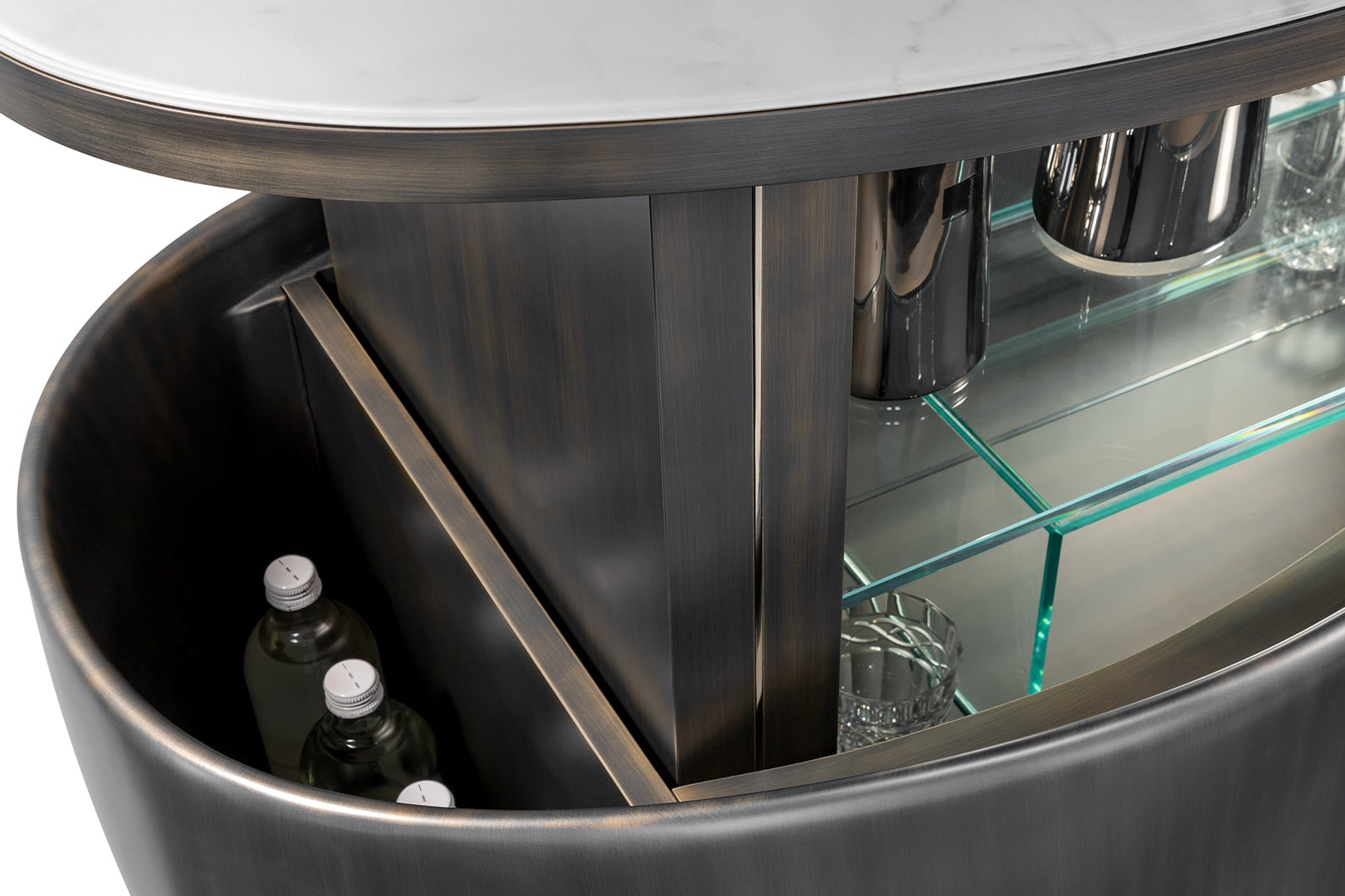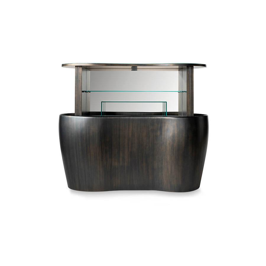 Gorgeous shaped bar in matte white lacquered finish with white lacquered glass top and clear glass shelves.