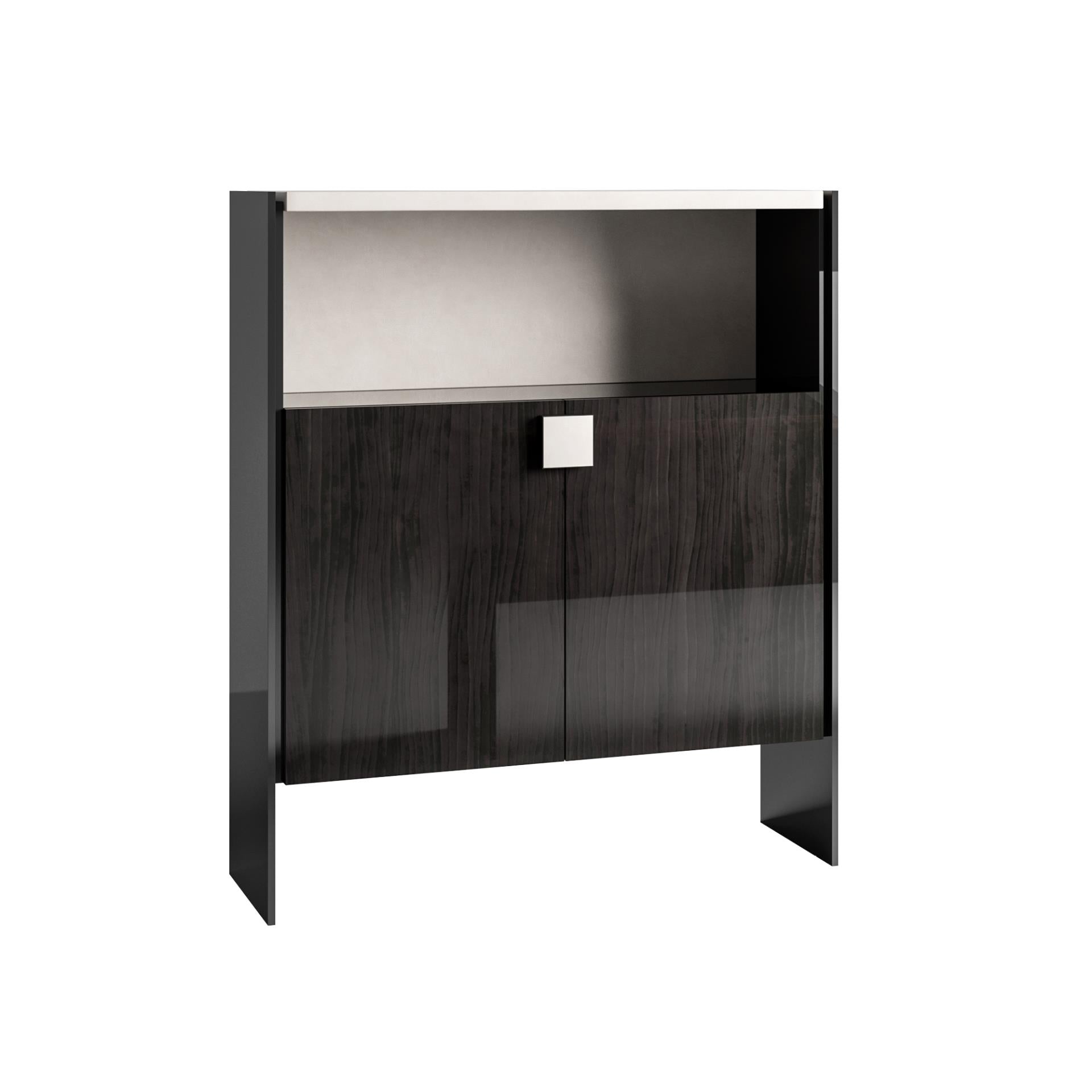 Sides available in black chrome or bronze finish. Doors in wood or upholstered in leather. Top comes in your choice of grade A leather. Lacquered interiors with leather insert on metal handle.