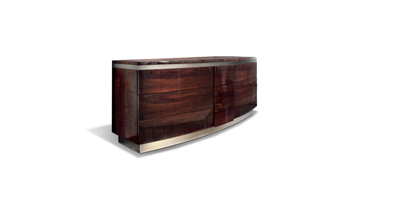 The tall boy skilfully crafted in combination of rare species of Brazilian rosewood timber with high gloss polyester finish and bronzed stainless steel details, exclusive to the Coliseum collection.