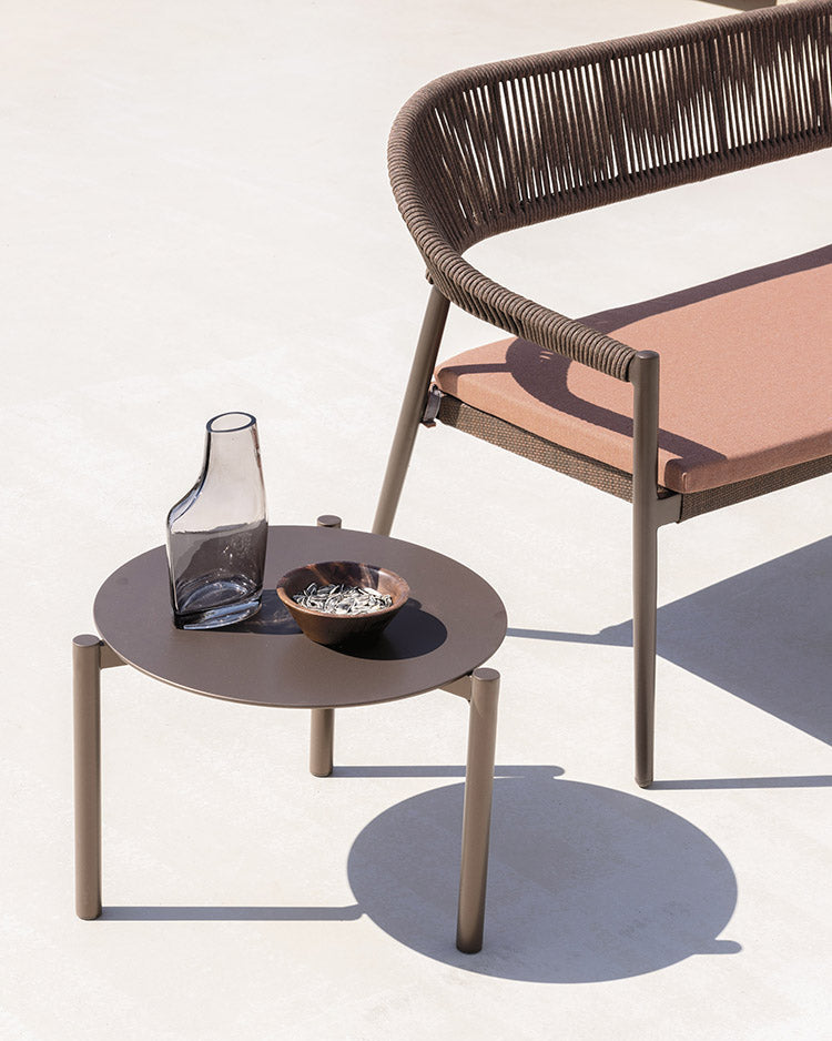 The Bahia outdoor table has a circular top that rests on an aluminum base. Its light and handy design makes it an easily transportable accessory.