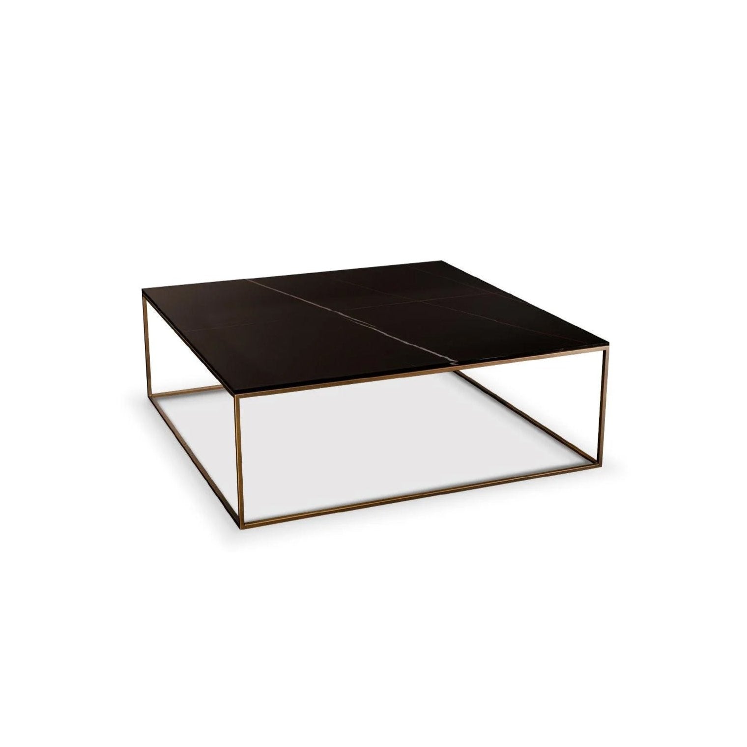 Coffee and side tables with metal base in brass finish and top in 10mm thick Marble glass.