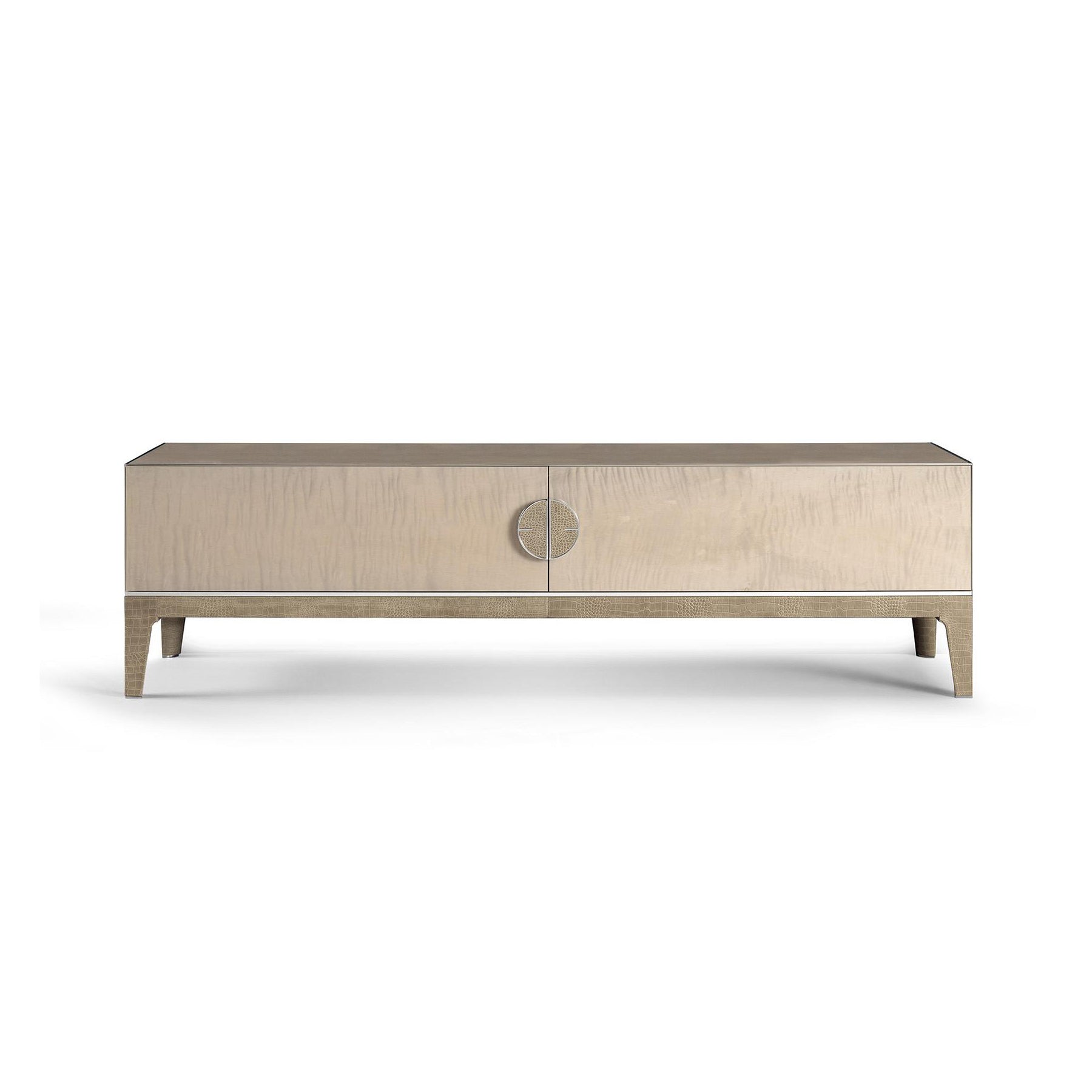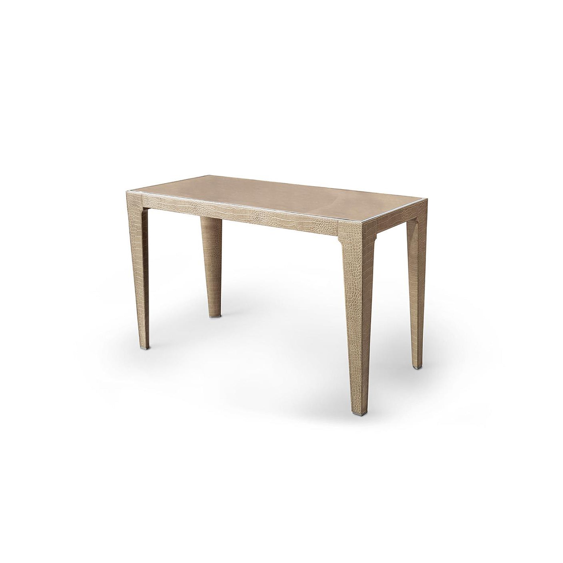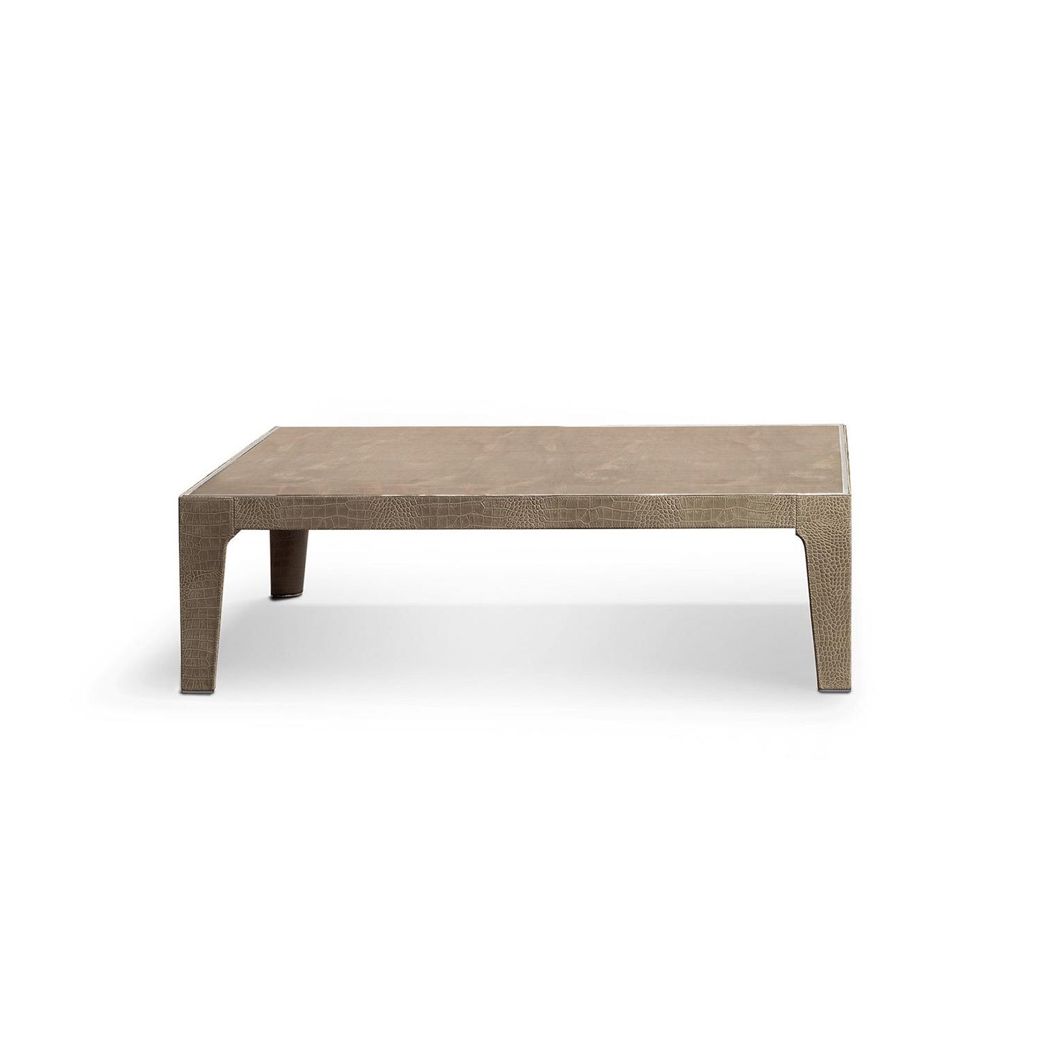 The M Place coffee table features timber top in a combination of matching coloured first grade Italian leather with crocodile stamped print legs, with beautiful chromed details.