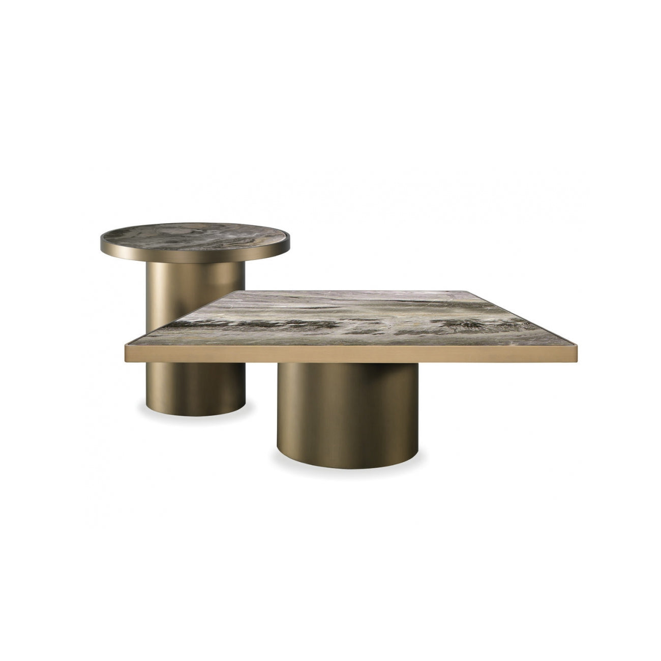 Collection of low and side table with cylinder base in the satin brass or titanium  metallic finishes. Wooden top in same finish with 40mm thick edge with inlay in lacquered or etched lacquered glass or in Marble glass. Also available with cylinder and top in shiny brass or titanium finish.