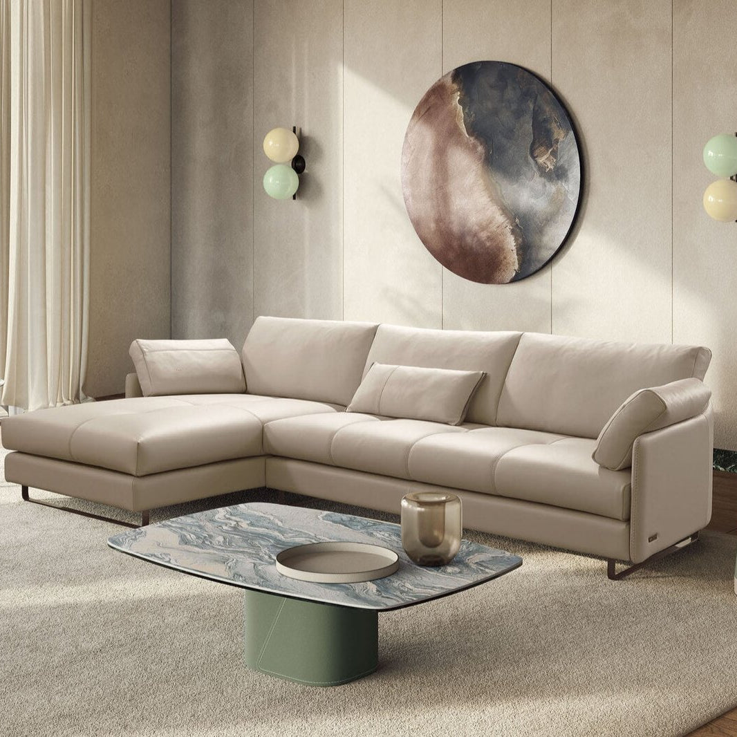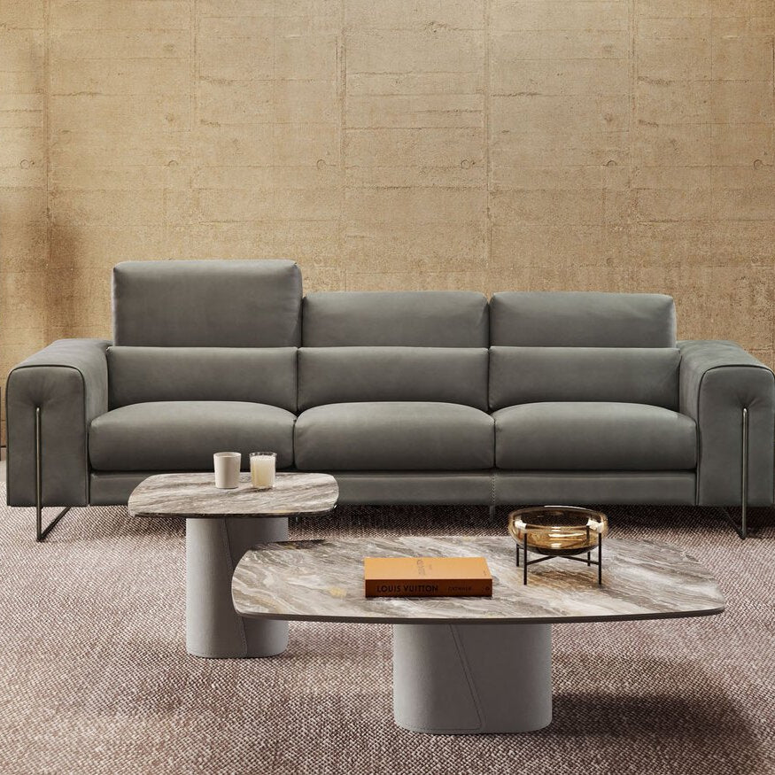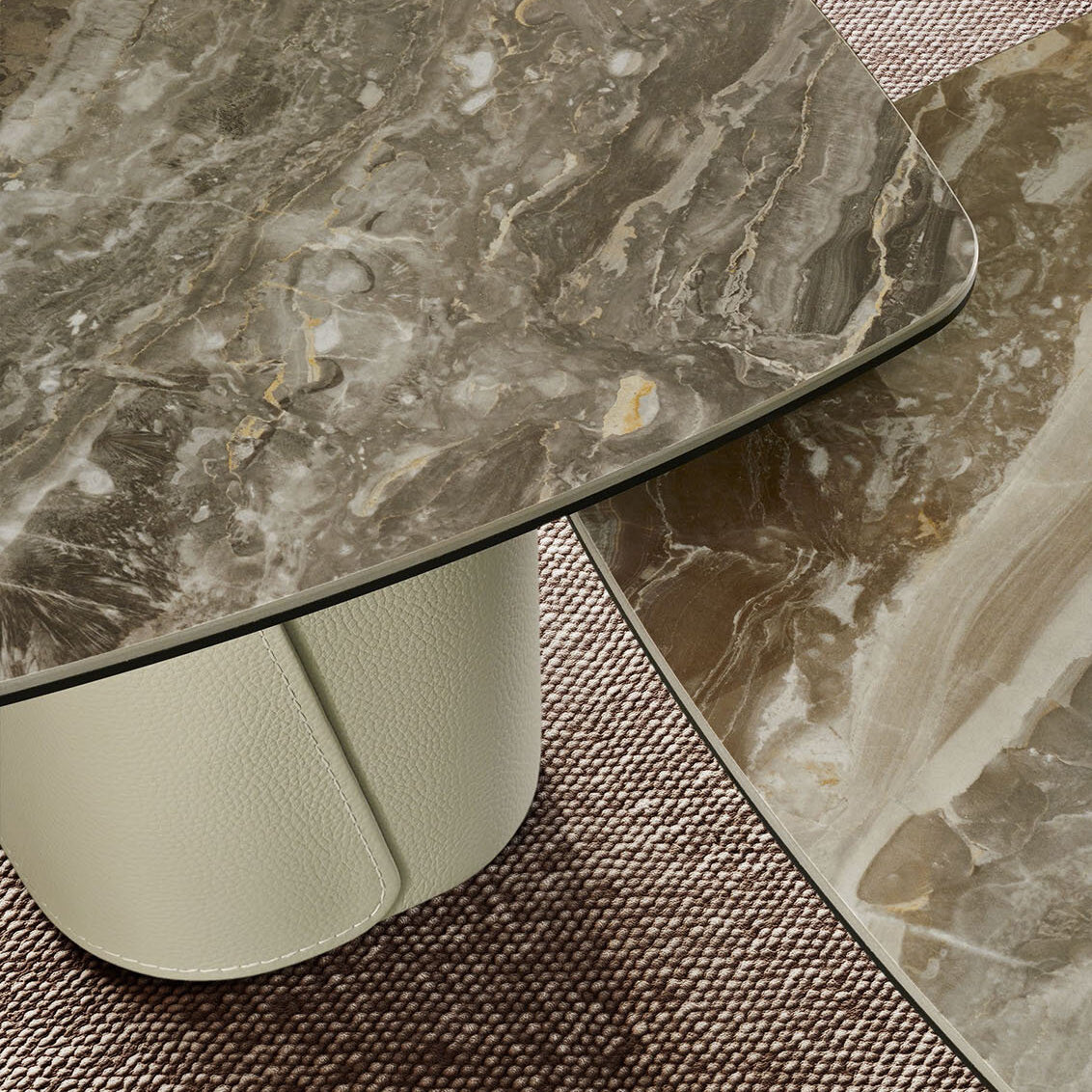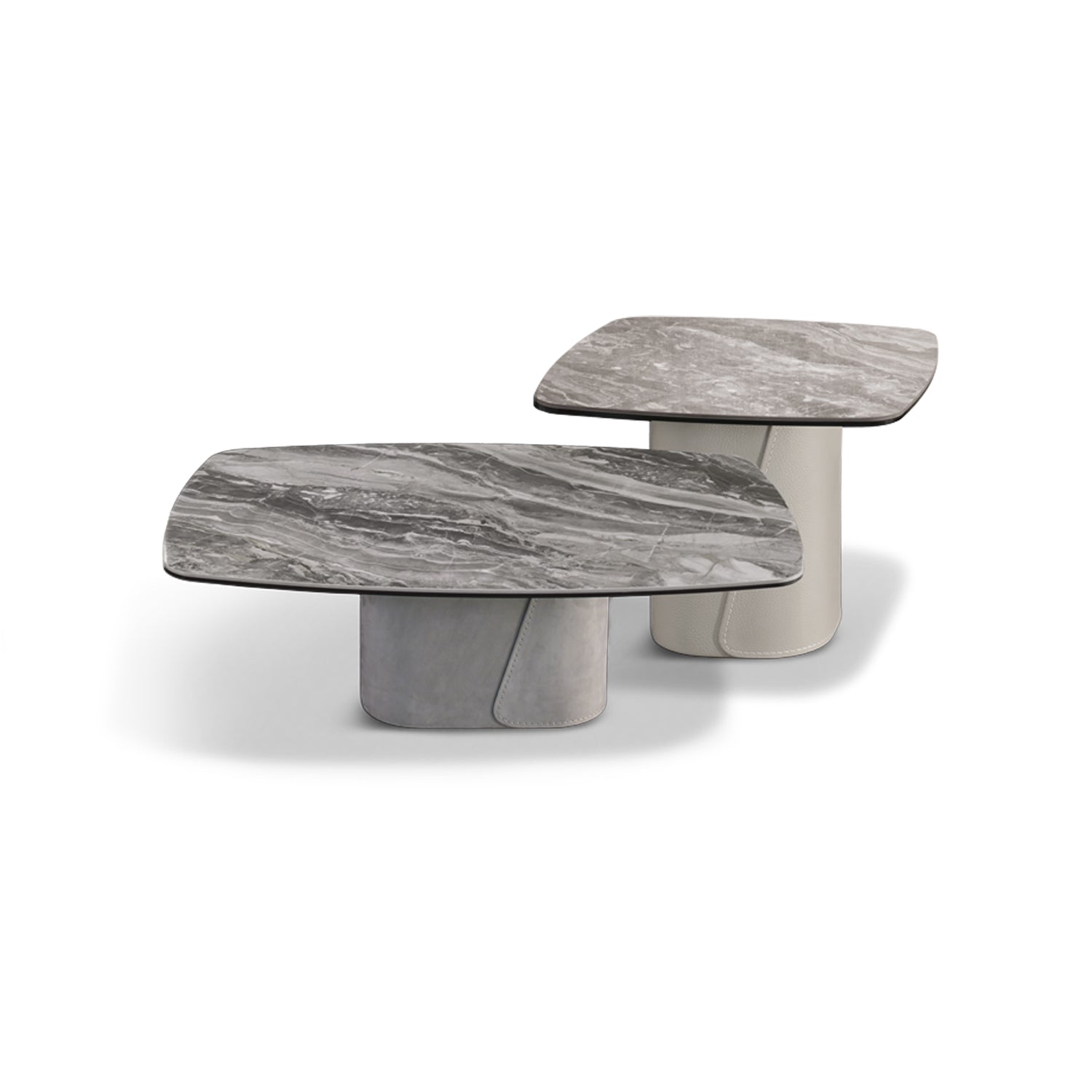 The Zen Coffee table features premium Italian leather sides with marble and ceramic options for the top. The curved design creates a contemporary look and feel. Perfect for customising to a specific colourway.