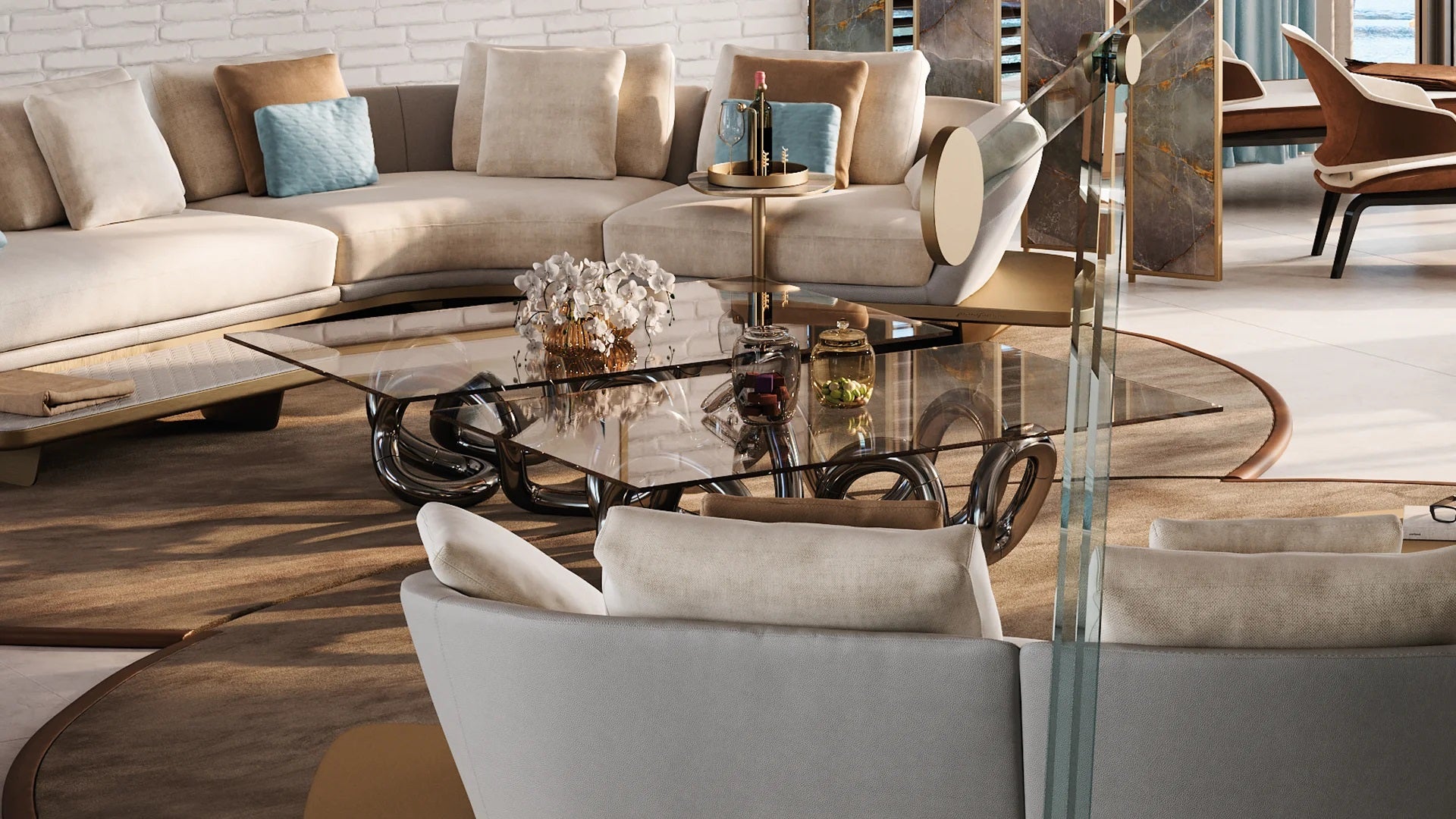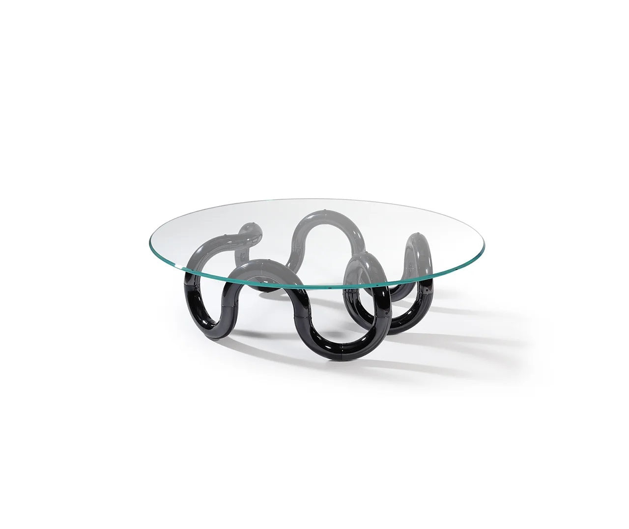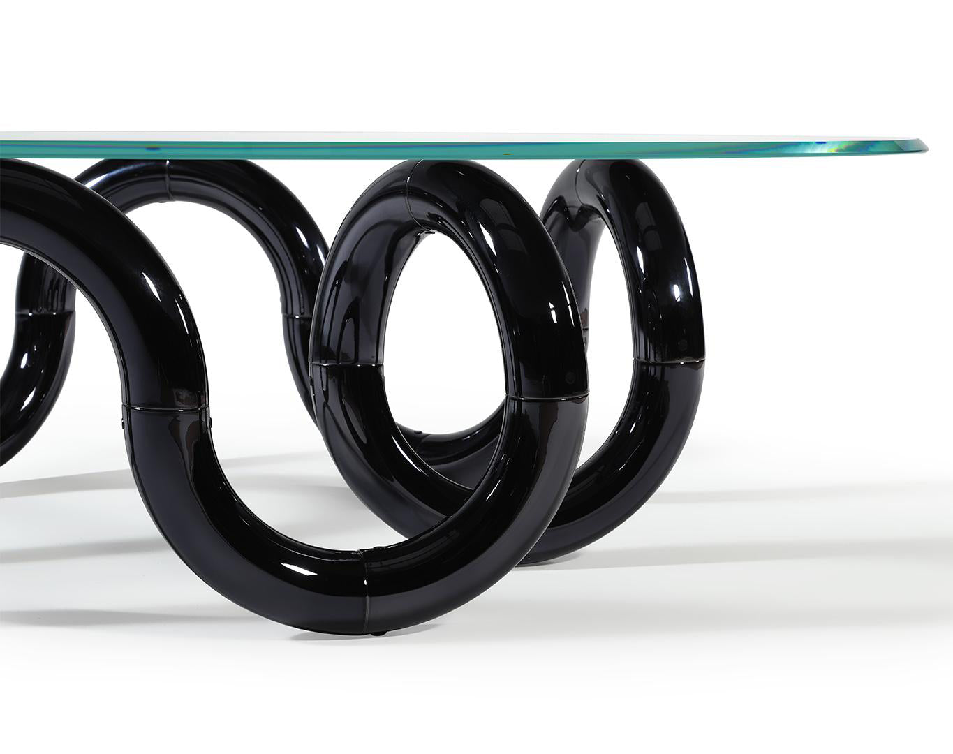 Absolutely unique coffee table with a base made of curved elements available in antiqued dark brass finish, shiny copper or shiny black nickel.