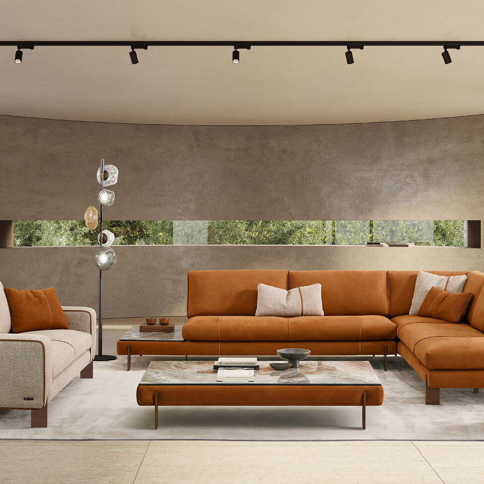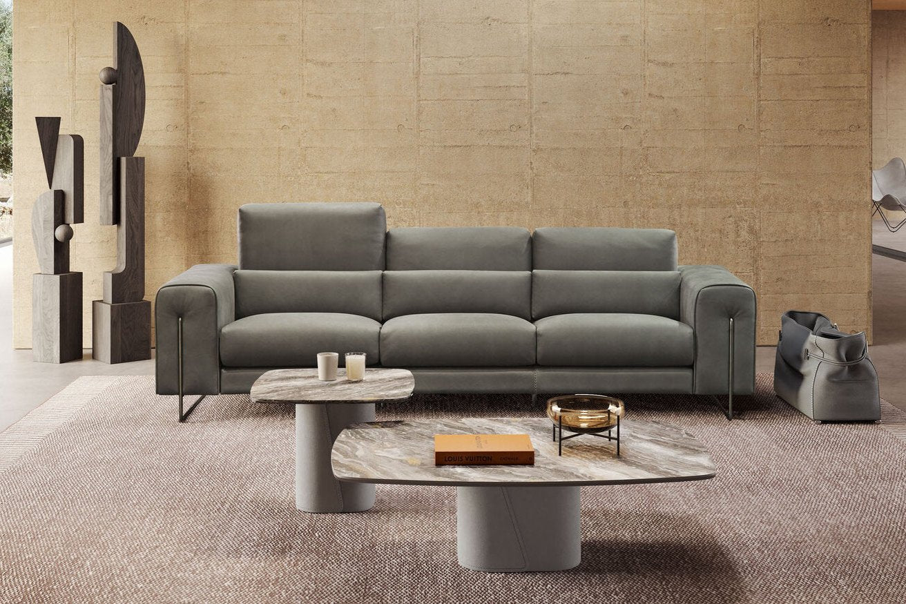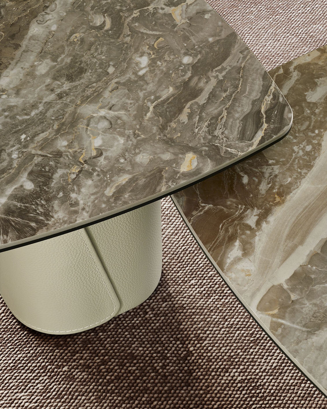 The Block Coffee table features a premium Italian leather base with marble and ceramic options for the top. Available in both circular or rounded rectangle designs. Perfect for customising to a specific colourway.