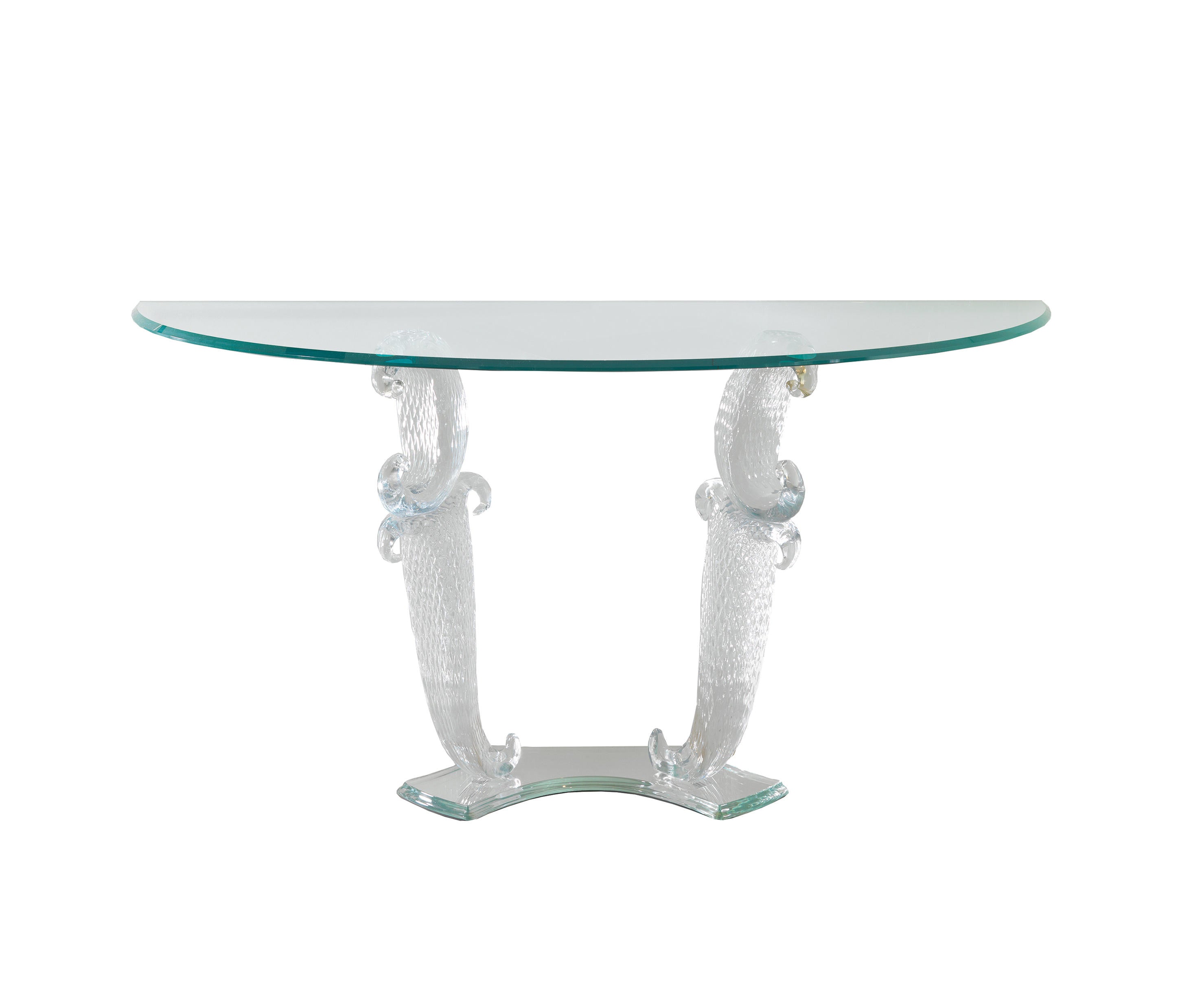 The Casanova console table is an absolutely stunning statement piece hand made of Murano glass legs by a traditional Venetian design. The Murano glass legs are available in transparent finish or in Fine Gold finish.