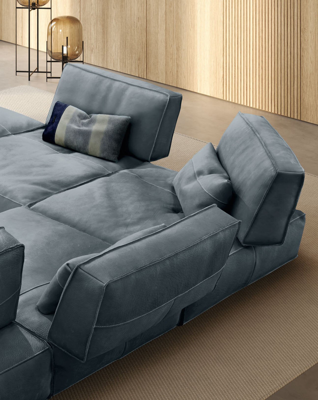 The thickness of this leather upholstery can be seen and felt in the edge-to-edge seam stitching. A shifting mechanism fitted to the backrest, including the corner, allows you to choose between two depths that can be adjusted according to your needs for comfort.
