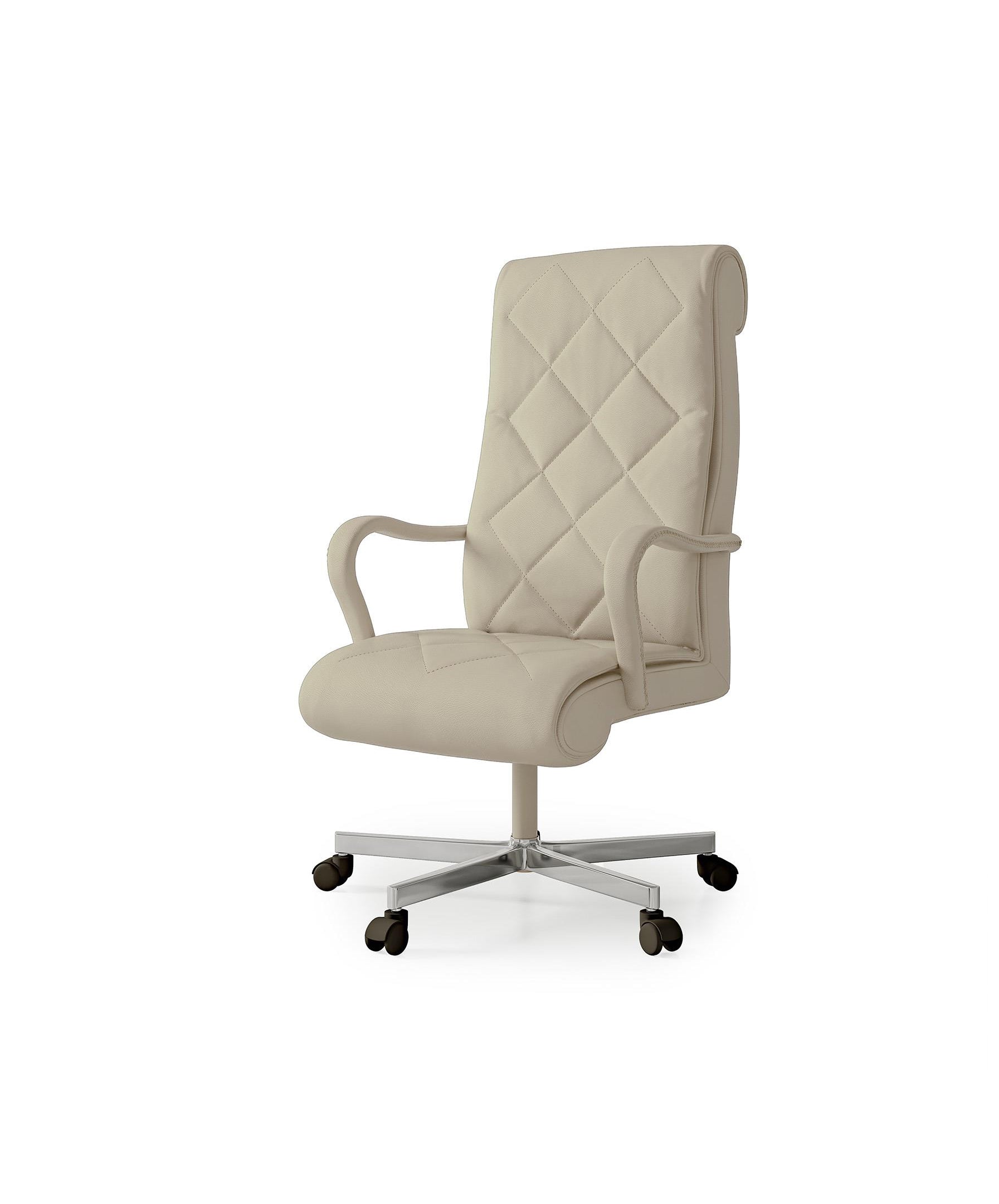 The executive chair is fully upholstered in your choice of Italian leather options or in a wide range of fabrics, with beautiful cross stitching back and back cushions.