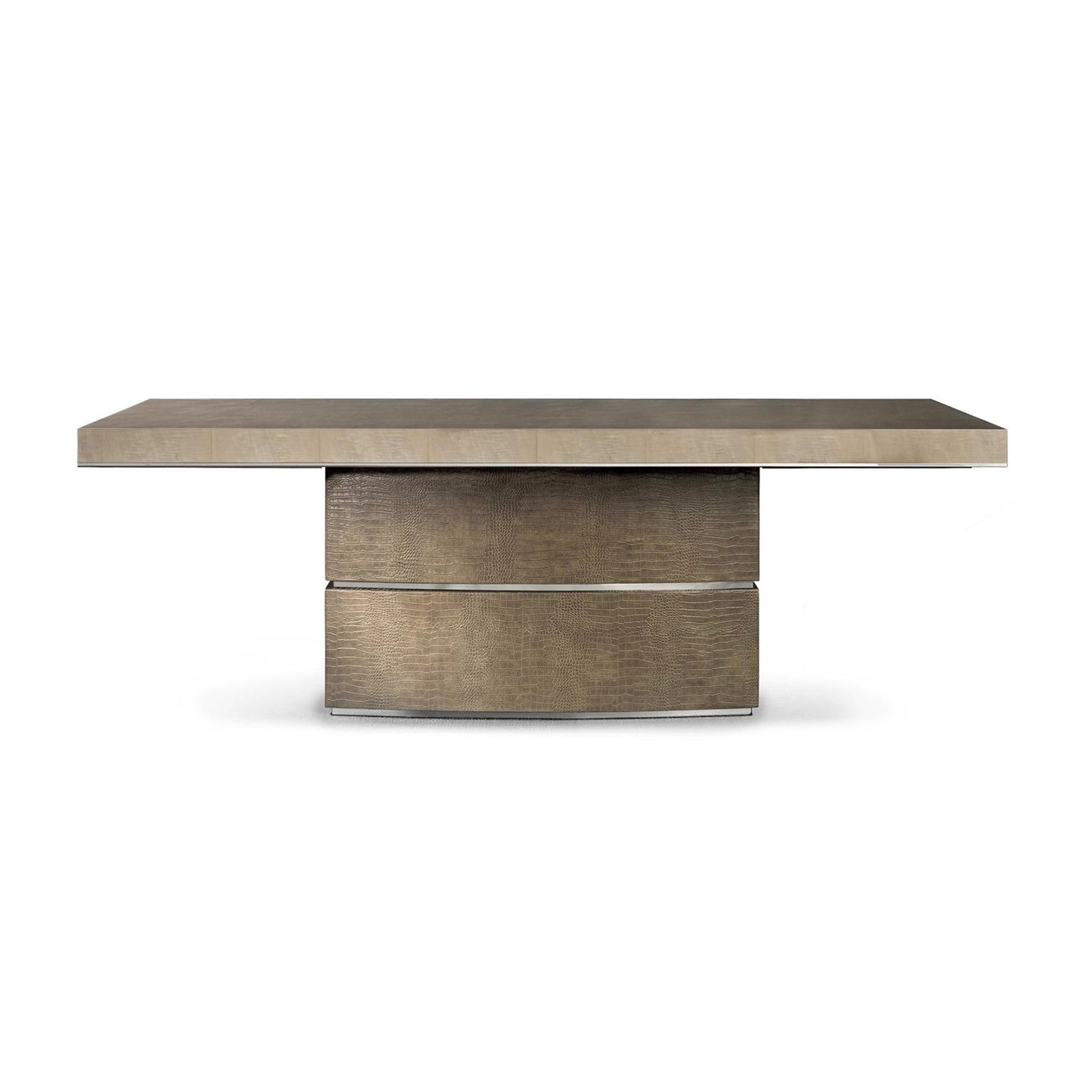 Featuring matching coloured first grade Italian leather with crocodile stamped print combined with beautiful chromed details, the M Place dining table is available with central column and extensions or with fixed top and four legs.