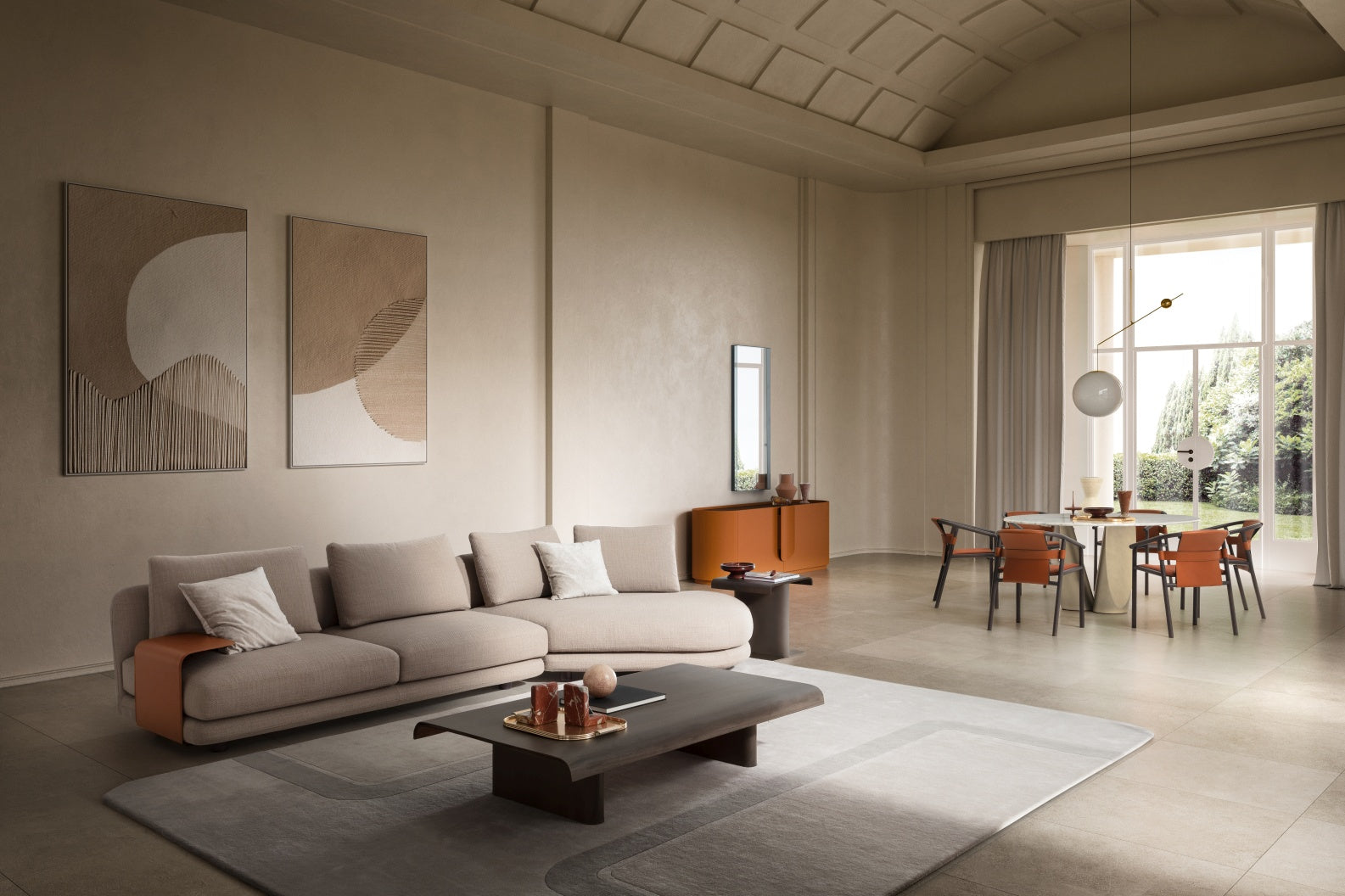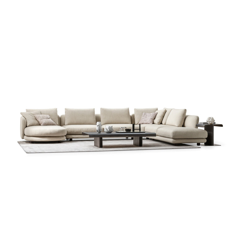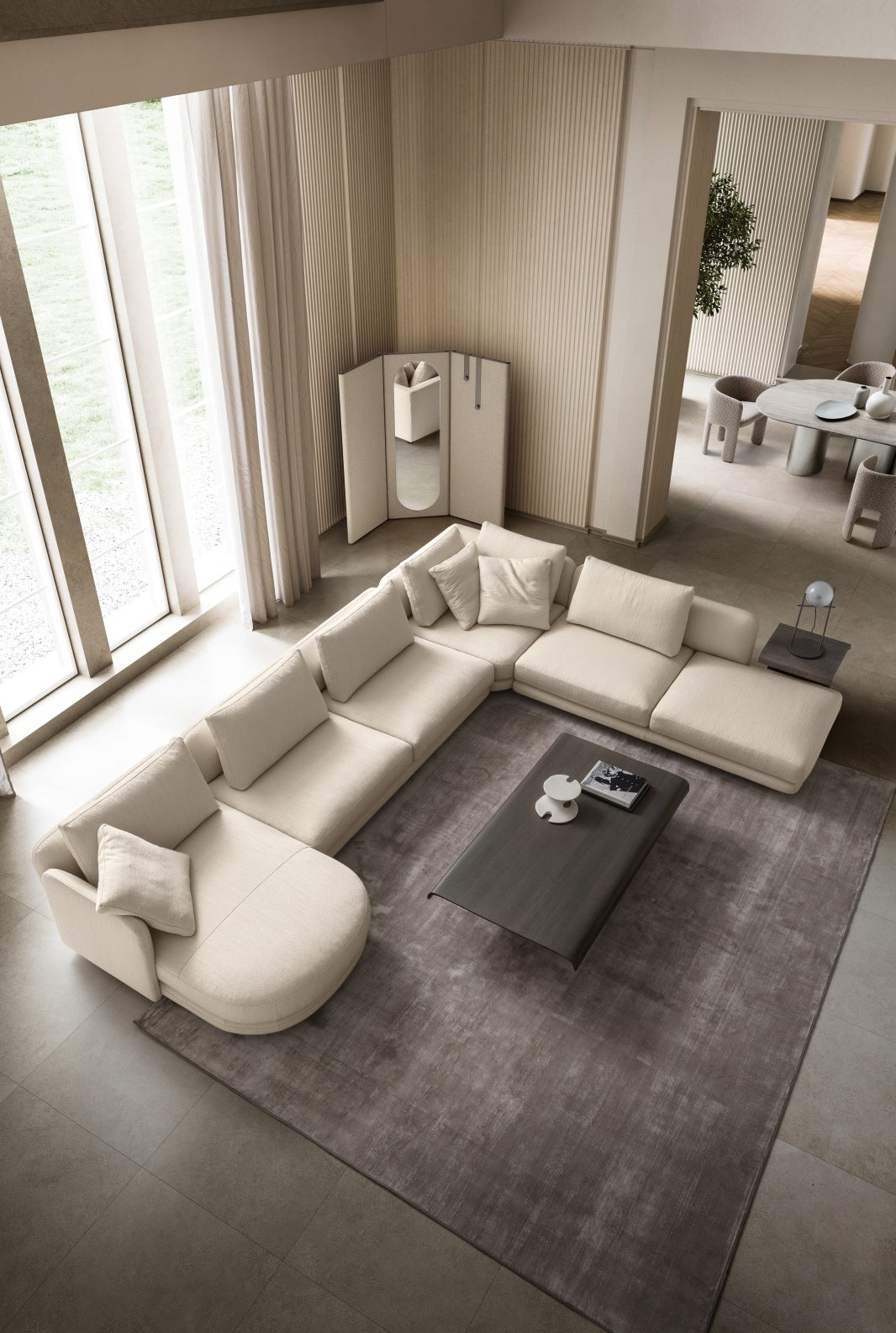 Avalon is a modular lounge with an elegant, modern classic design. Elevated by the stunning curved chaise and leather armrest detail. Available in a multitude of luxury Italian fabrics and leathers.