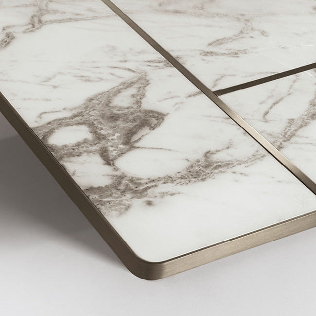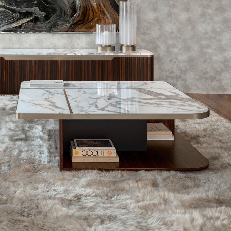 A square cocktail table with a white marble top and a dark wood veneer base, with stainless steel legs.