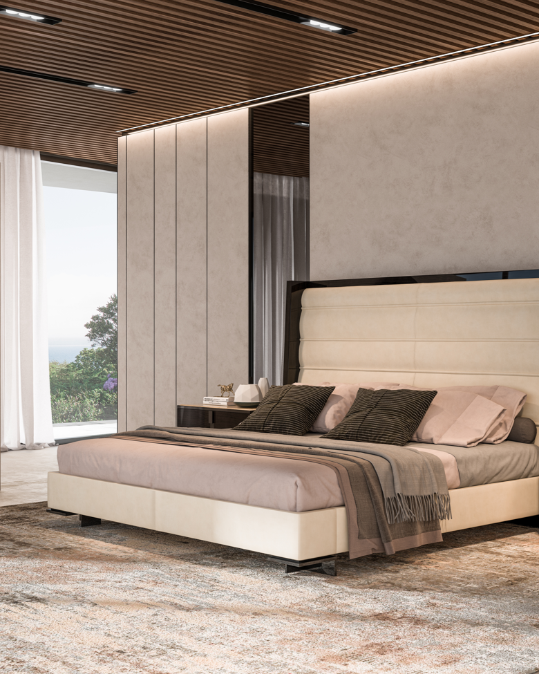 Beautiful bed with framed headboard in Black Onyx timber and upholstered in first grade Italian leather (with your choice of colour) and complementing bench, also available in fabric as well as Nabuk leather.