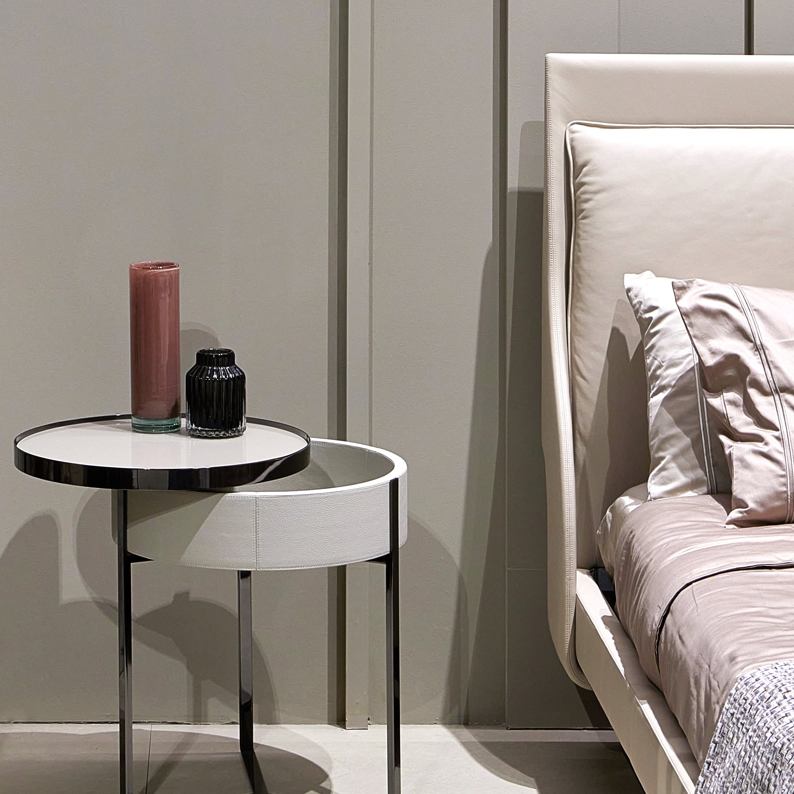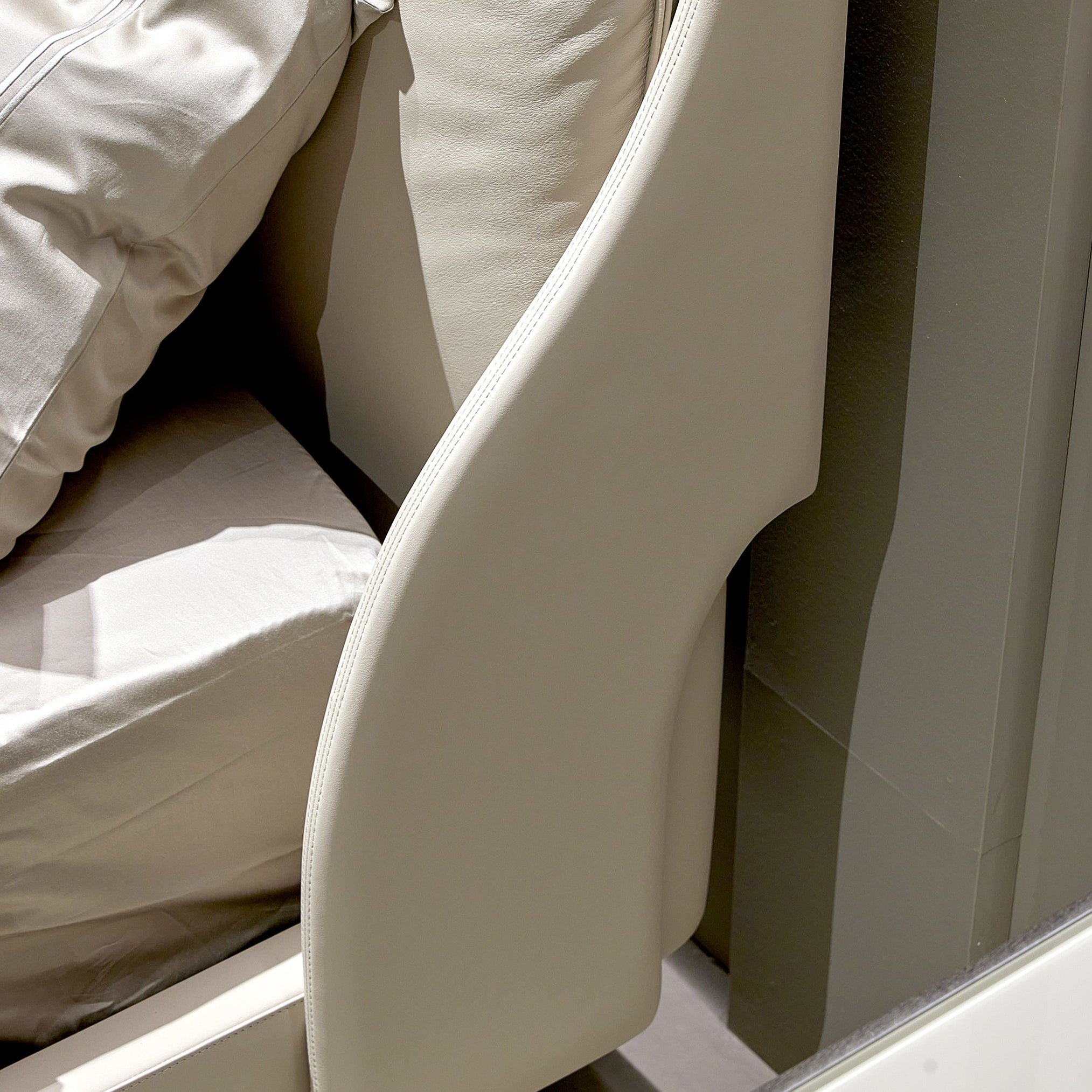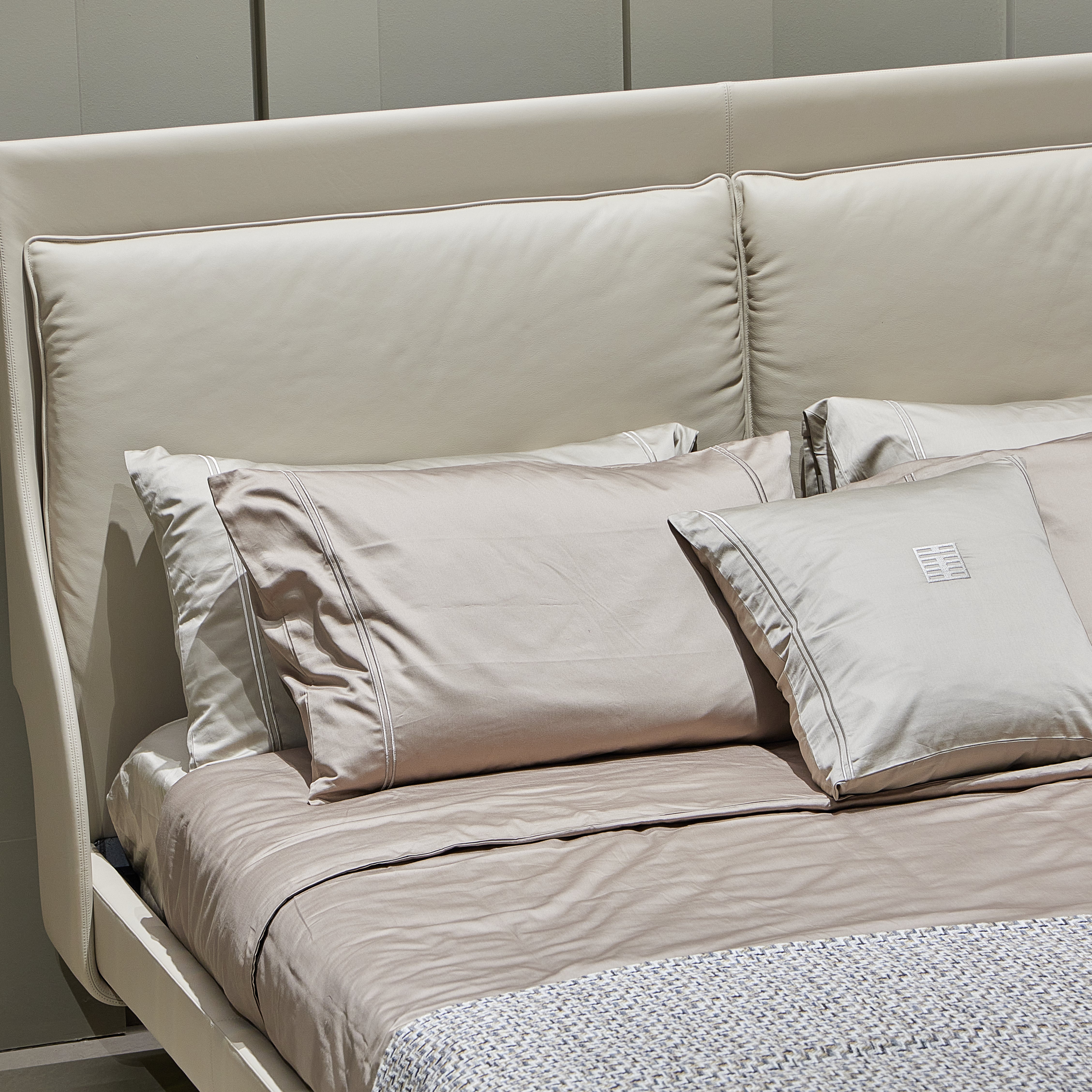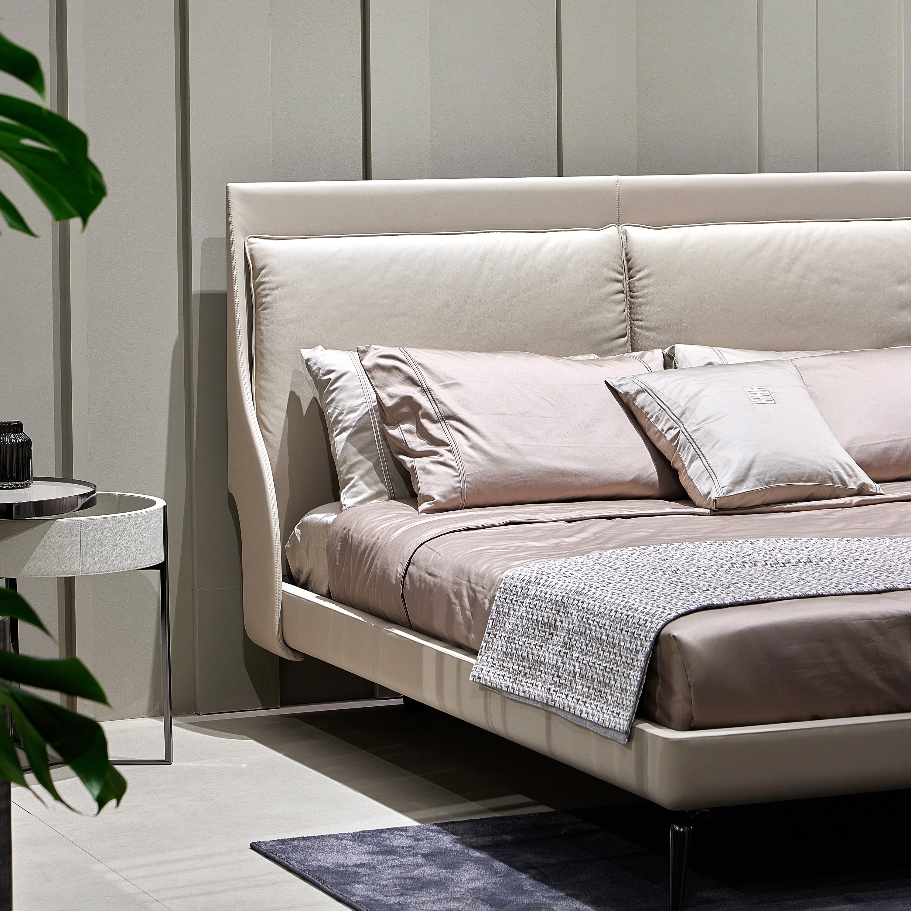 Next Level is a refined bed featuring leather-covered feet and a fully upholstered frame. The headboard is enhanced by elegant stitched detailing, adding texture and character. Fully customizable with leathers from our exclusive collection. Available in multiple sizes.