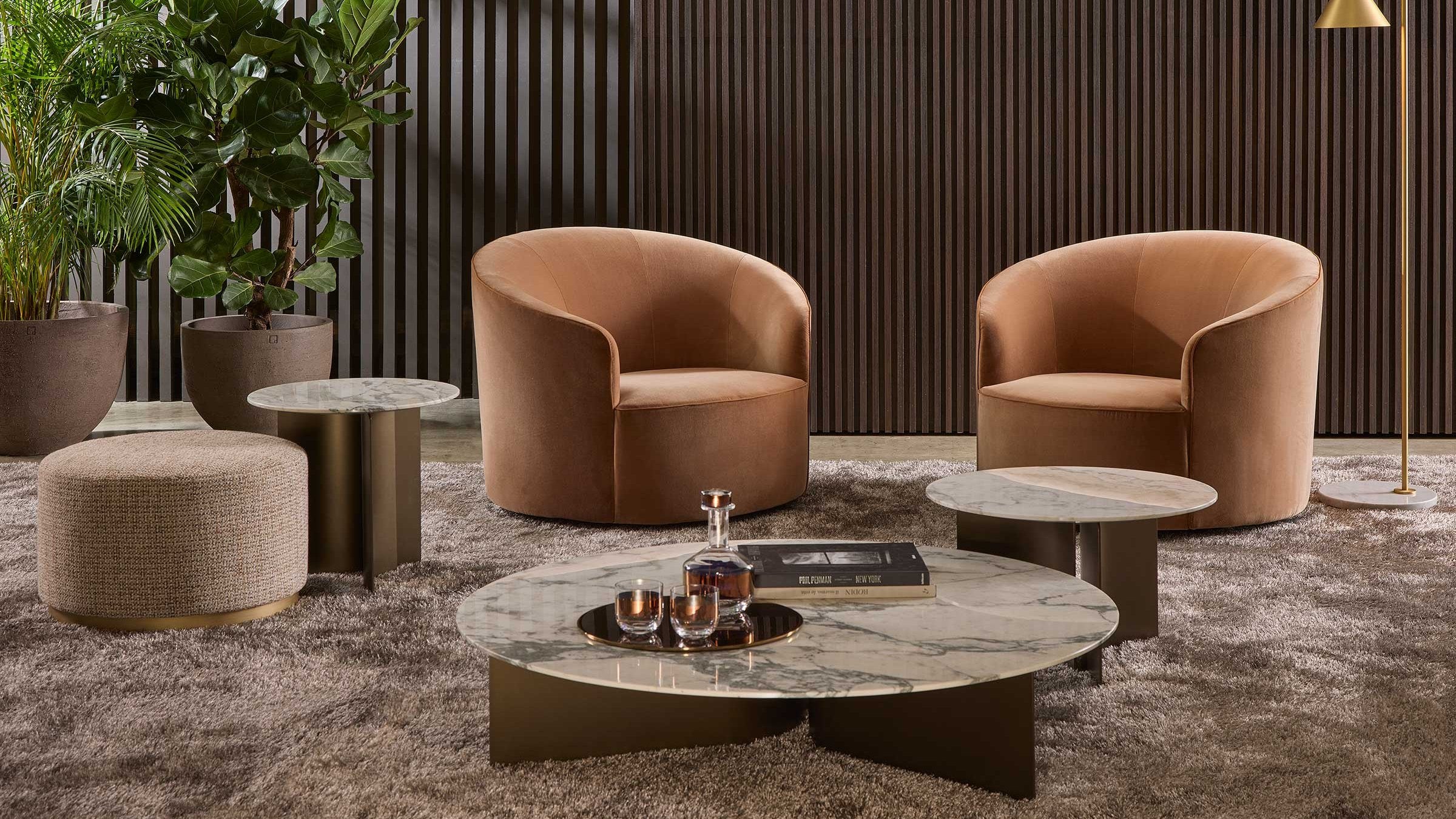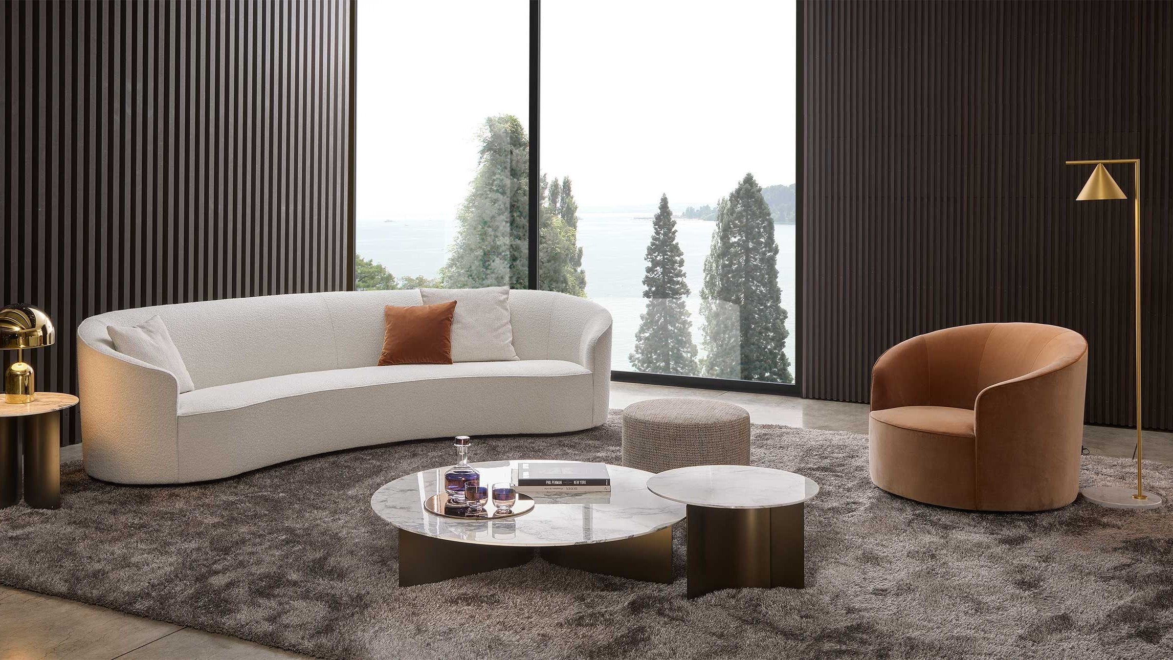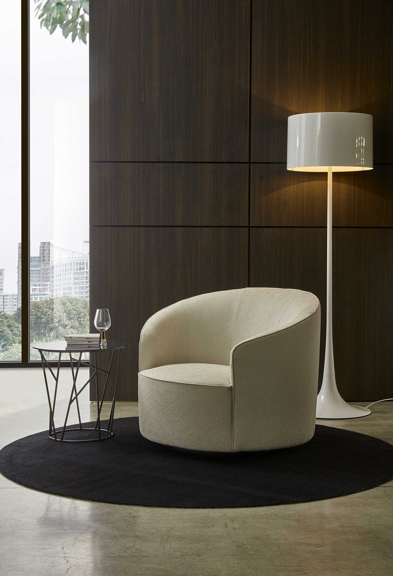 The Moon collection is characterised by curved, elegant lines, with soft, rounded volumes in the upholstered parts and a light metal base on which they rest. This combination offers a design that is distinguished by its lightness, while at the same time presenting solid and compact volumes. Available as a swivel or fixed base in a range of different upholstery options.