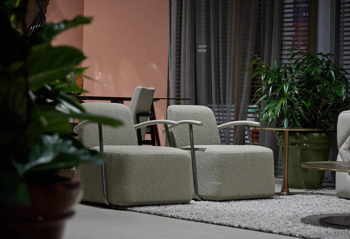 The Hug Occasional Armchair is part of Malerba's Stay Collection. Choose from Italian leather or fabric cushions, leather-covered armrests and metal frame in brass or pewter finish. Customizable from our collection to match your style.