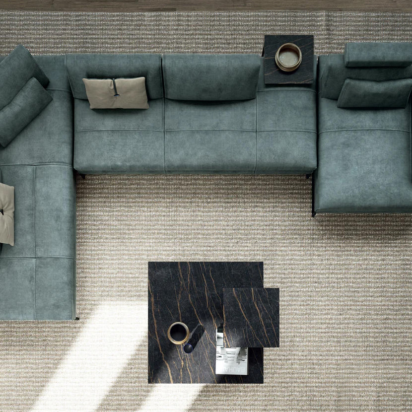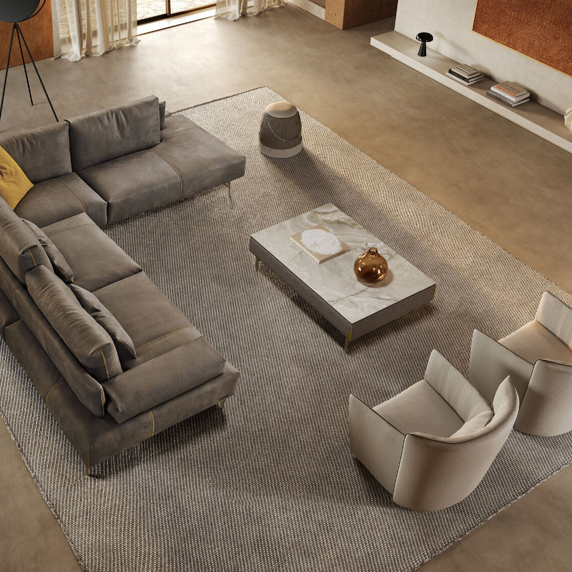 Hardwood frame, seat suspensions in reinforced elastic webbing. Seat and back cushions in polyurethane. Metal swivel base and legs available in: chrome, dark chrome-titanio, burnished copper, burnished aluminium or painted metal. Back cushion detail in Caucciù black color.