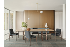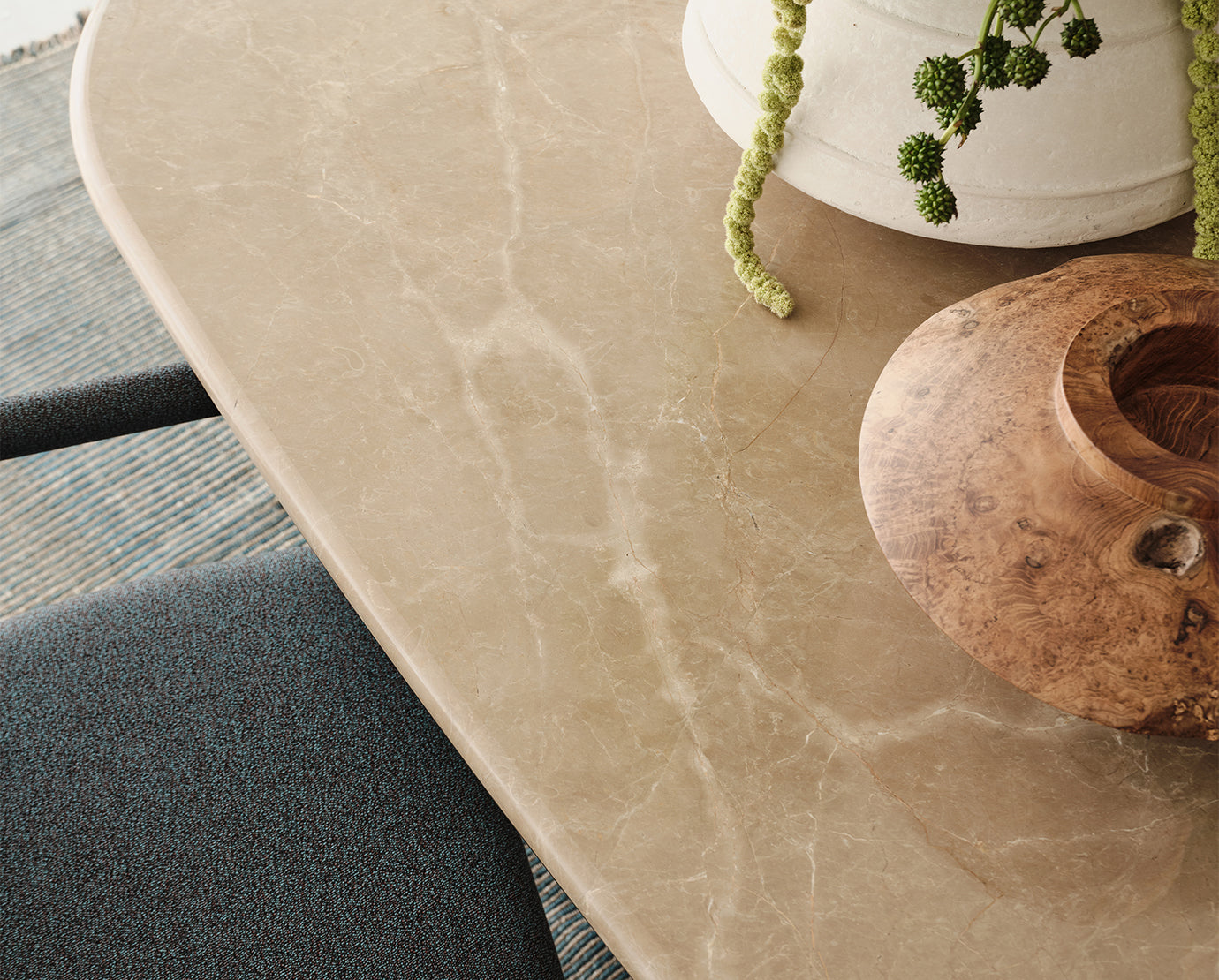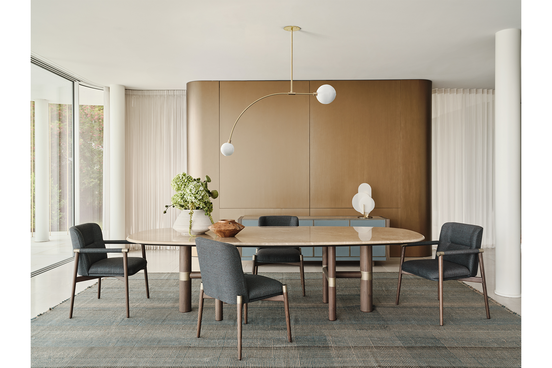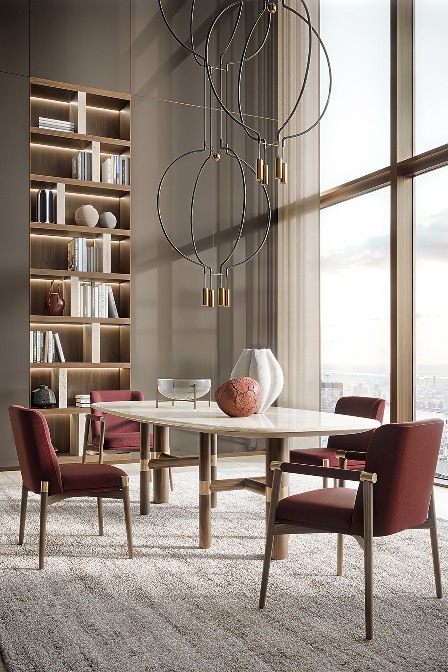 Atelier table represents the core of the dining room: its legs – example of the excellent craftmanship- are made of three cylinders able to give a great refinement to the structure. The walnut wood together with the brass metal inlays placed in the middle of the legs, embodies the clear and sophisticated aesthetics of the current fashion trends.