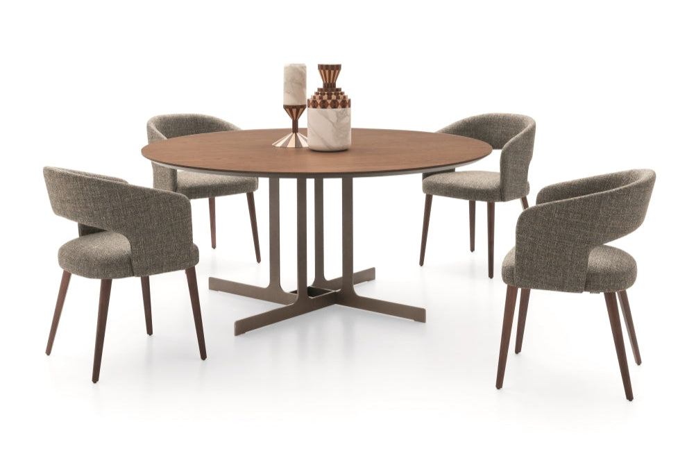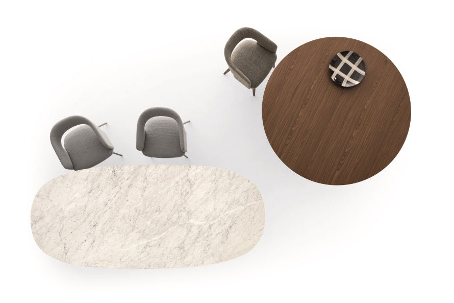 A collection of tables with a contrasting wood, marble or glass top resting on an extremely light frame. The very thin metal blades of the base allow it to be used either separately or in pairs, for round, oval or rectangular tables.