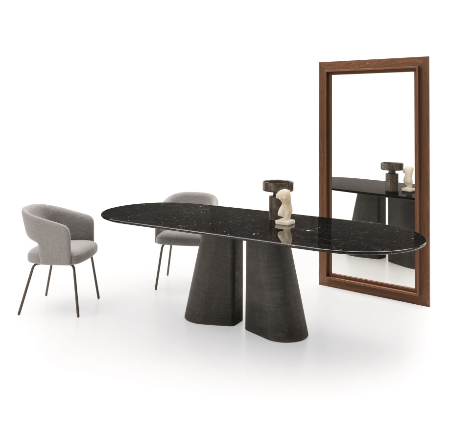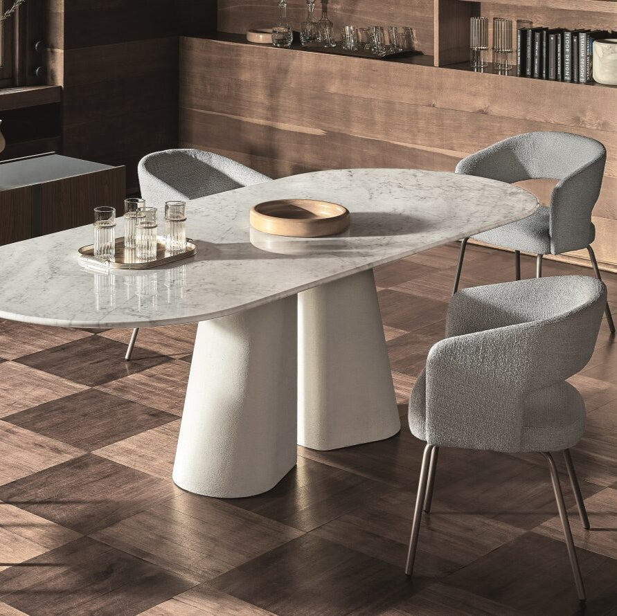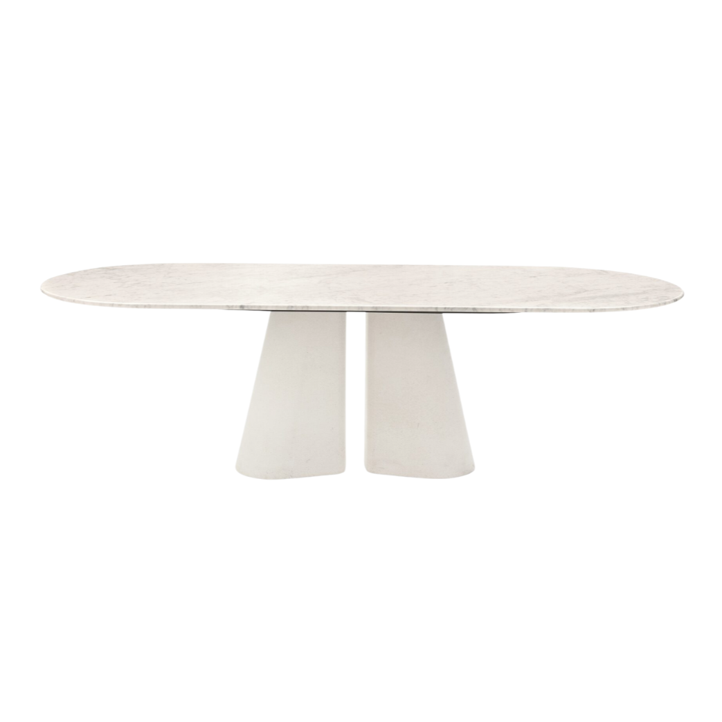 A minimalist top rests on a sculptural base formed by two columns inspired by the Greek agora. Its complexity is revealed by the covering in primary materials such as cement and marble. A table discreetly furnishes the dining area.