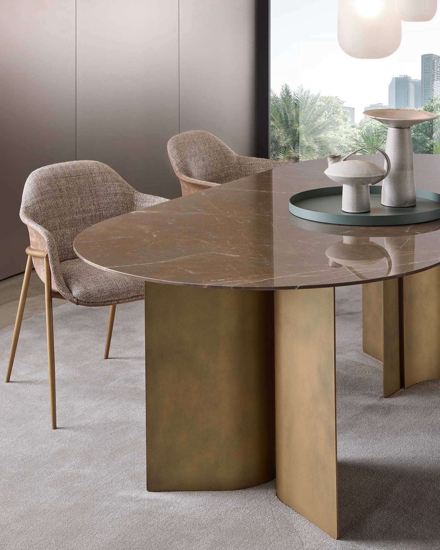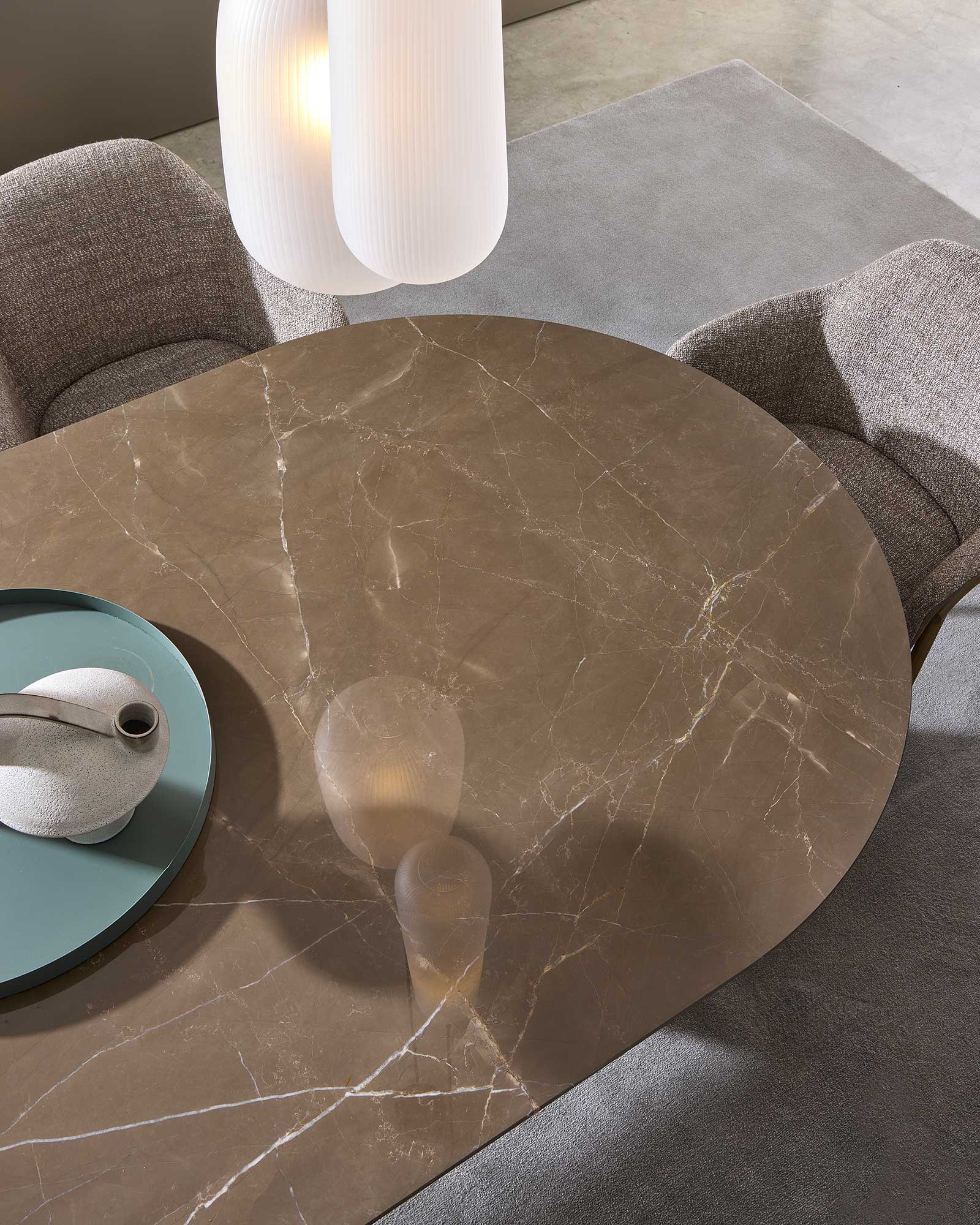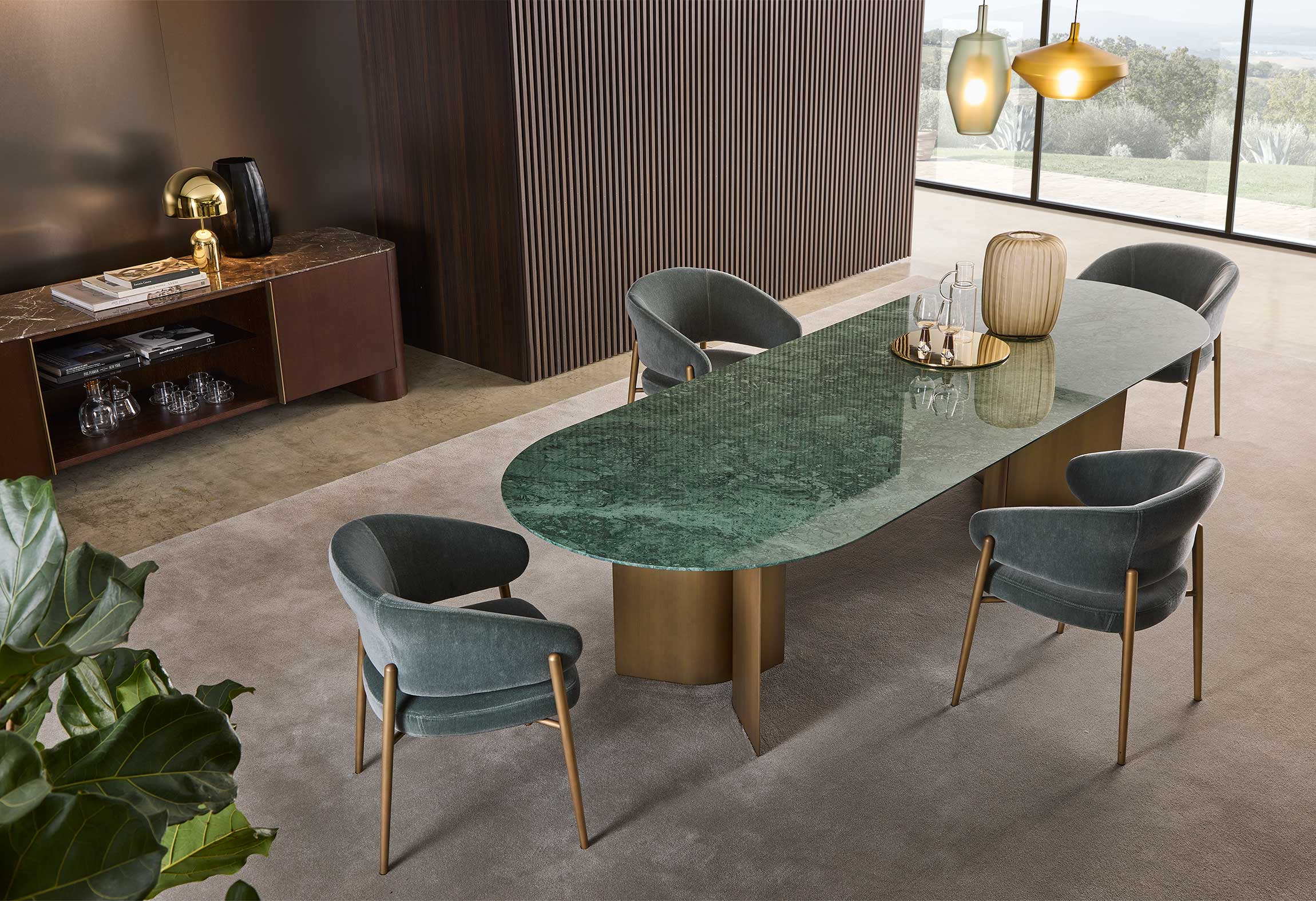 The Wave family of dining and coffee tables is remarkable for its scenic presence and versatility, which give them a great sense of lightness. This is particularly evident in the design of the finely rounded legs, which create an interplay of volumes and contrast with the lightness of the table top.
