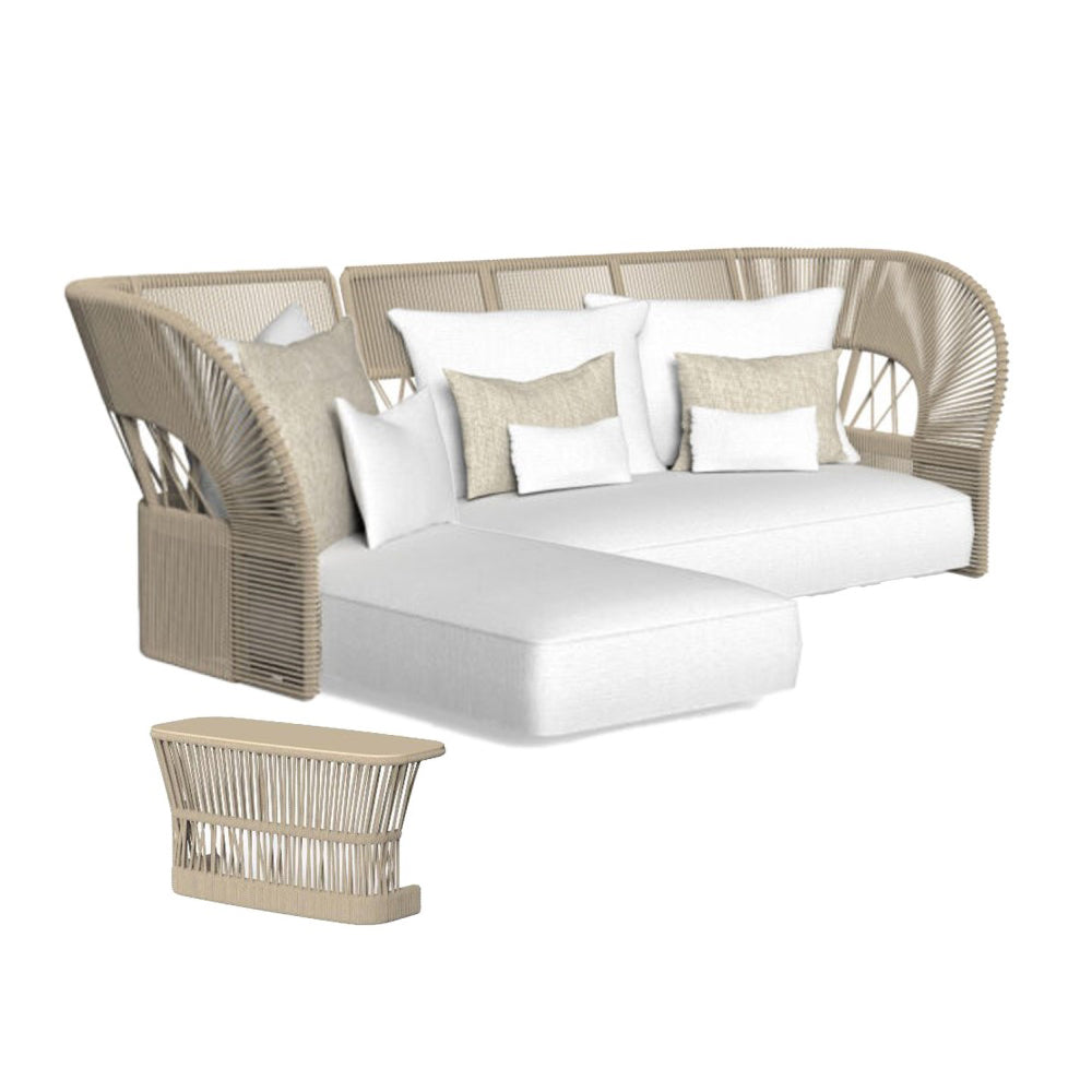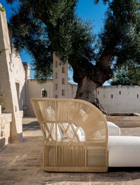 The Cliff Decò sofa is large and elegant. Its backrest, realized in nautical synthetic rope, matches the cushion fabric, creating a pleasant contrast. The aluminum frame guarantees solidity to the product.