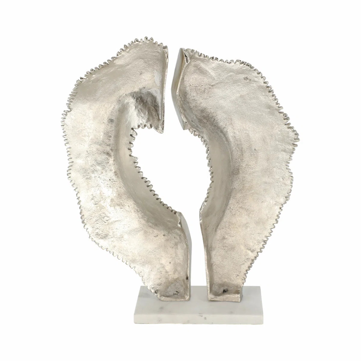 Elevate your interior with this striking silver-painted aluminum sculpture, designed to add a touch of modern elegance to consoles, buffets, or shelving displays. Its sleek metallic finish catches the light beautifully, creating subtle reflections that enhance any space. Lightweight yet durable, this sculptural piece serves as a versatile decorative accent, effortlessly complementing contemporary, minimalist, or eclectic interiors. Perfect for styling living rooms, entryways, or dining areas, it brings a sophisticated, artistic touch to your home.