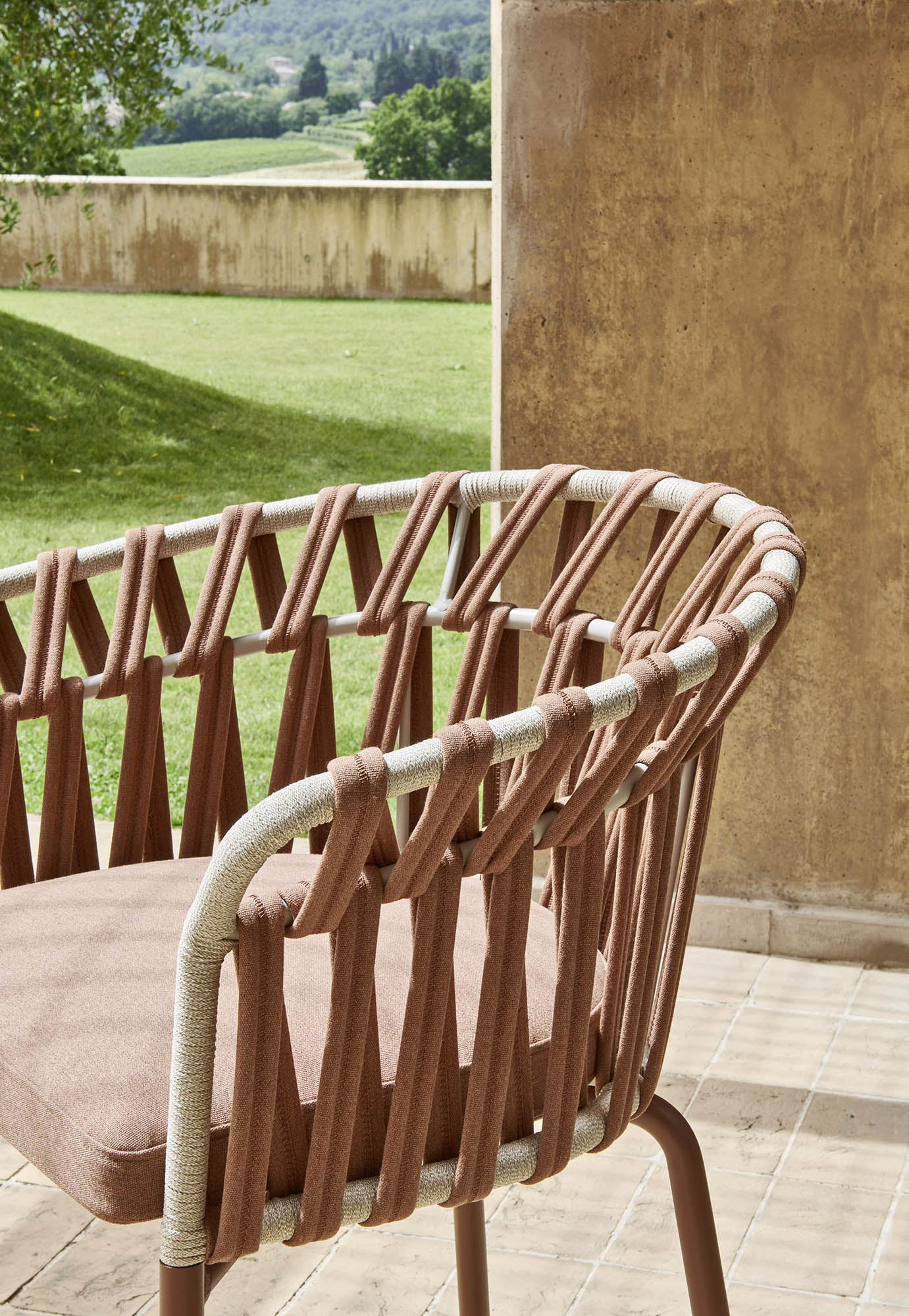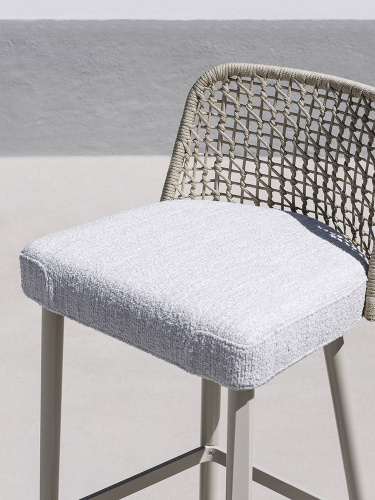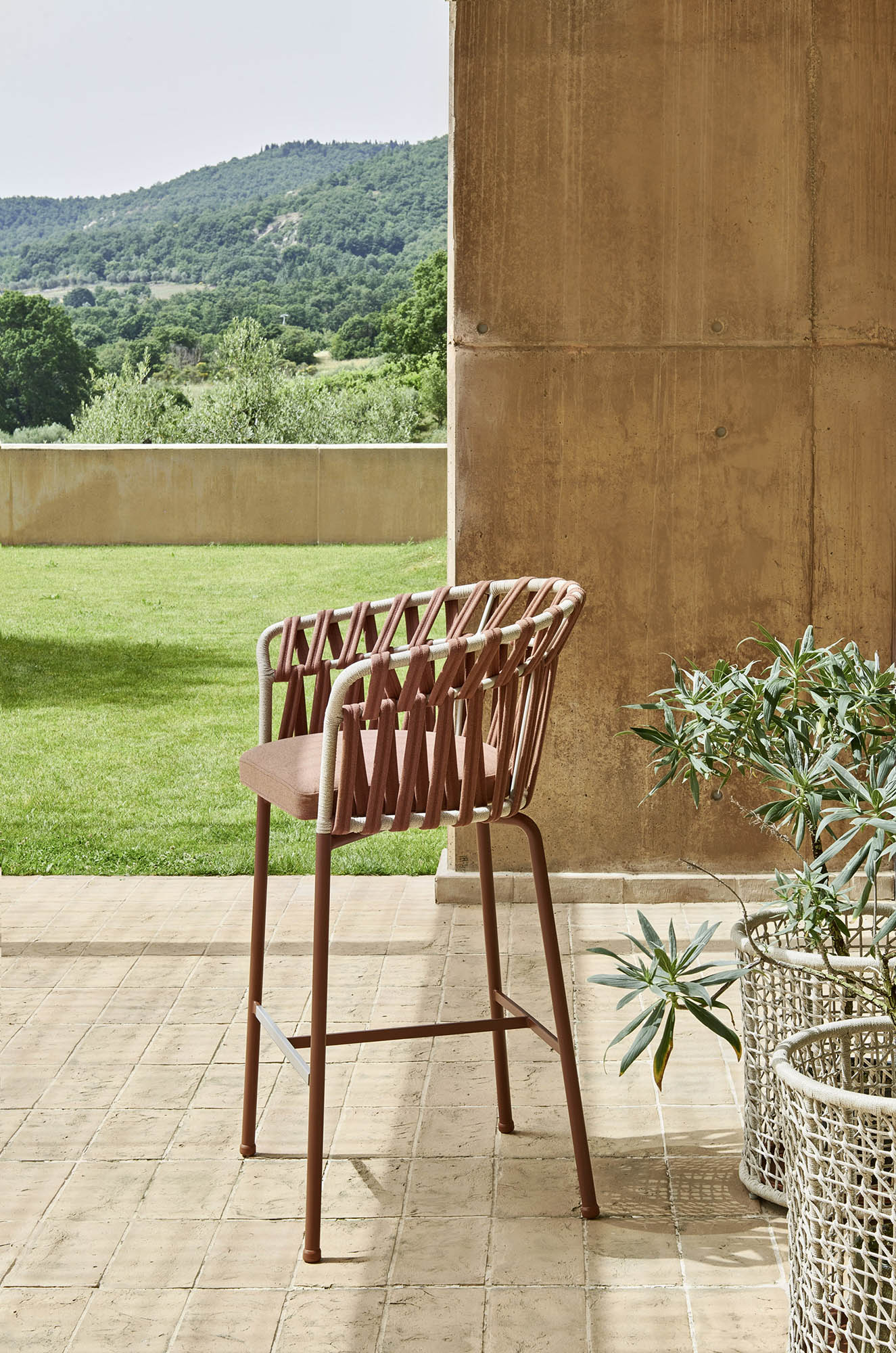 The steel rod structure of the Summer Set stool gives shape to a curved lattice with ergonomic lines, made even more welcoming by a soft cushion.