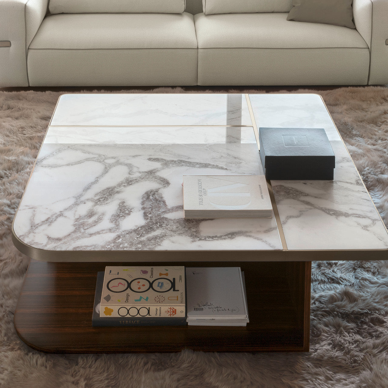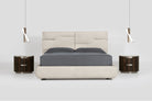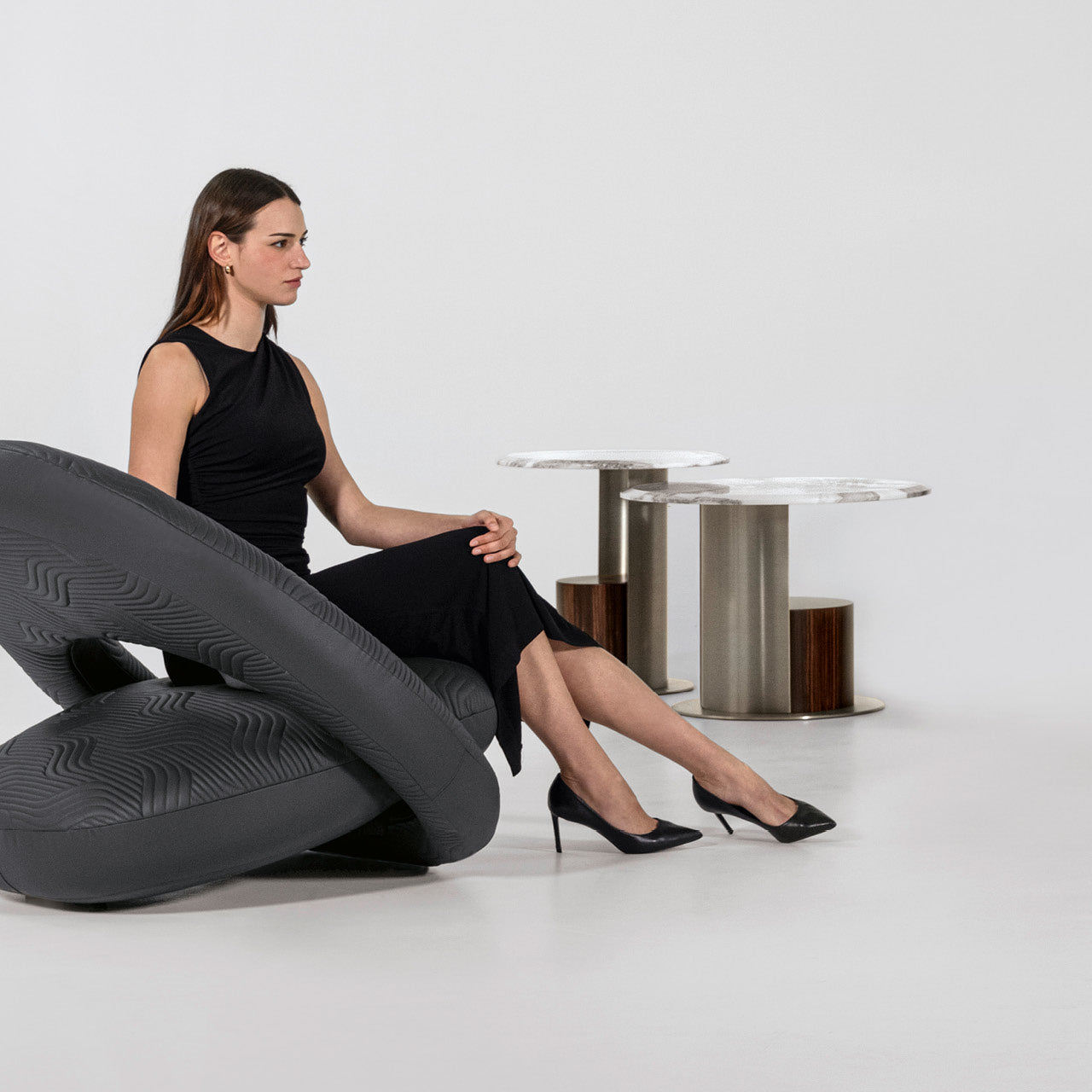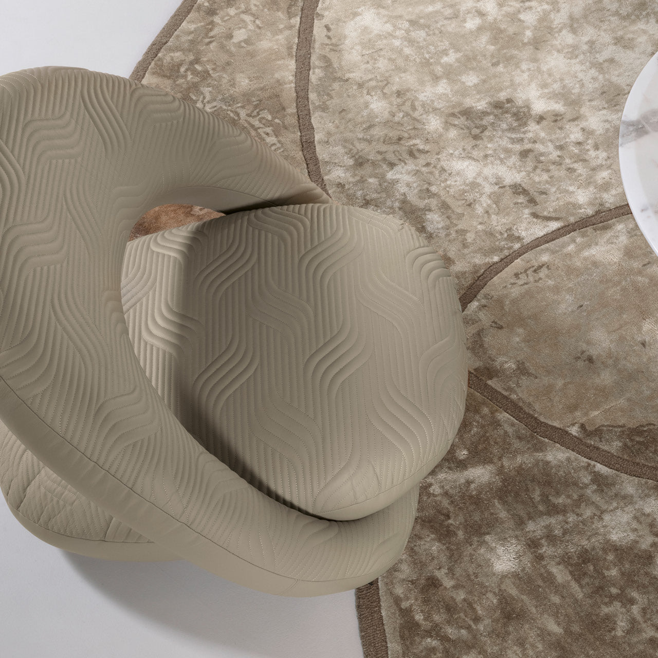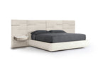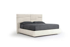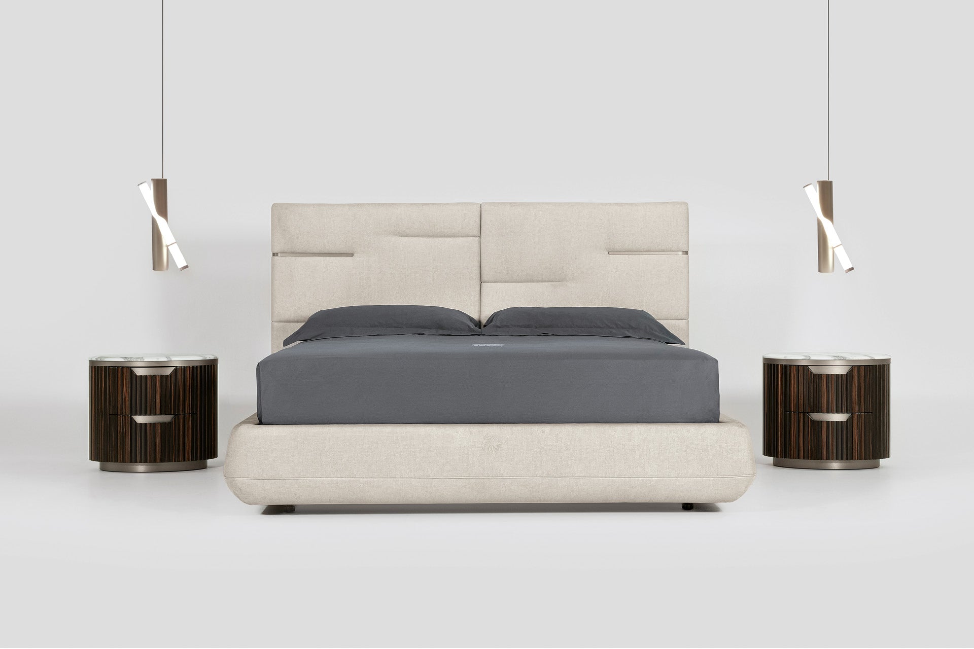 Fully upholstered bed available in first-grade leather, nubuk leather, lizard printed leather or fabric with embroidered Giorgio Collection logo on the footboard. Quilted headboard with base and inserts in satin galvanised titanium finish stainless steel. Available in three different sizes.