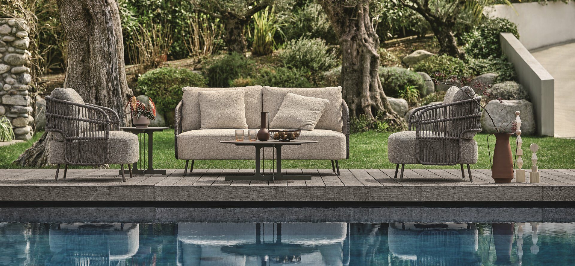 356 Outdoor echoes the design of the 356 chair and features a unique wrap-around backrest surrounding the edge of the seat. The collection includes Lounge, Sofa, and Daybed designs, bridging technology and tradition, true to the Ditre Italia brand.