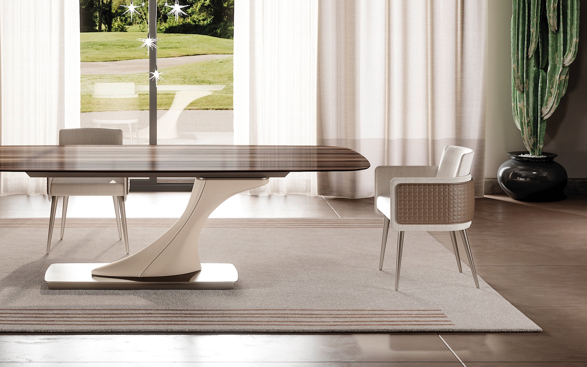 The salient features of the Amet chair are simplicity and lightness of the shapes, strengthened and highlighted by the external cover, which can be customized according to the project needs. The chair has padded seat and back with different density layers to improve the subjective and objective comfort of the user. The ash wood legs are available in the satin metallic finishes, lacquered or in stained wood finishes.