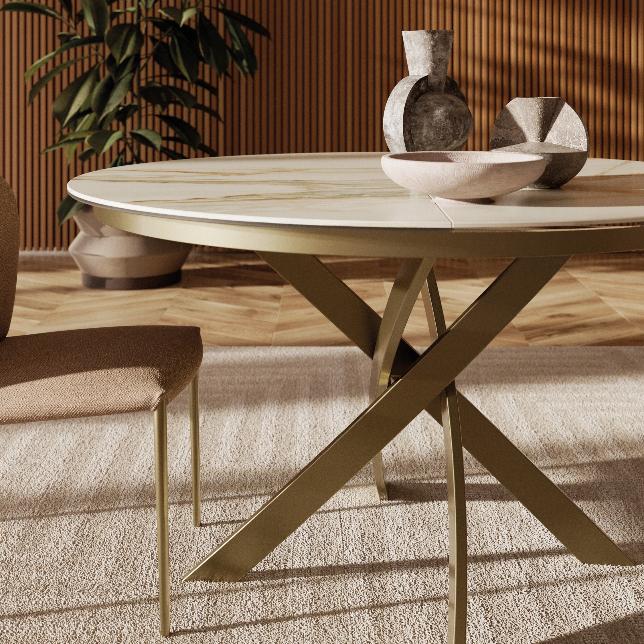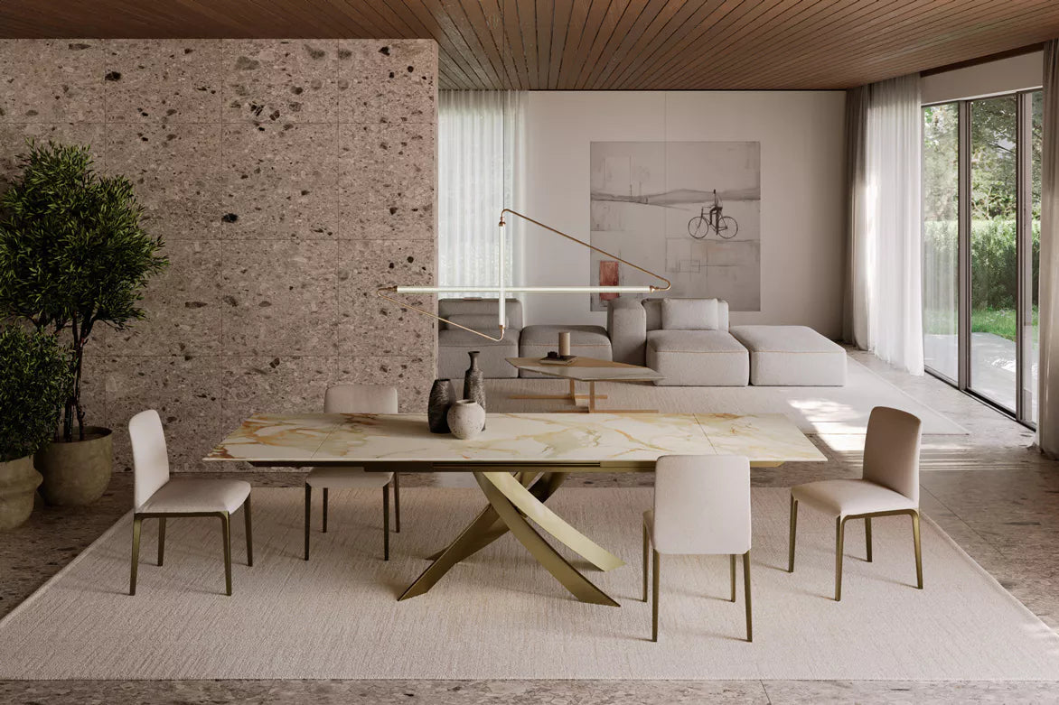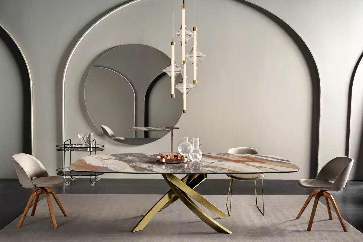 The sculptural metal base is offered in a selection of finishes, including dark brass, aged brass, multicolour elegant, and natural silver, reinforcing its identity as a contemporary Italian luxury dining table with accessible elegance.