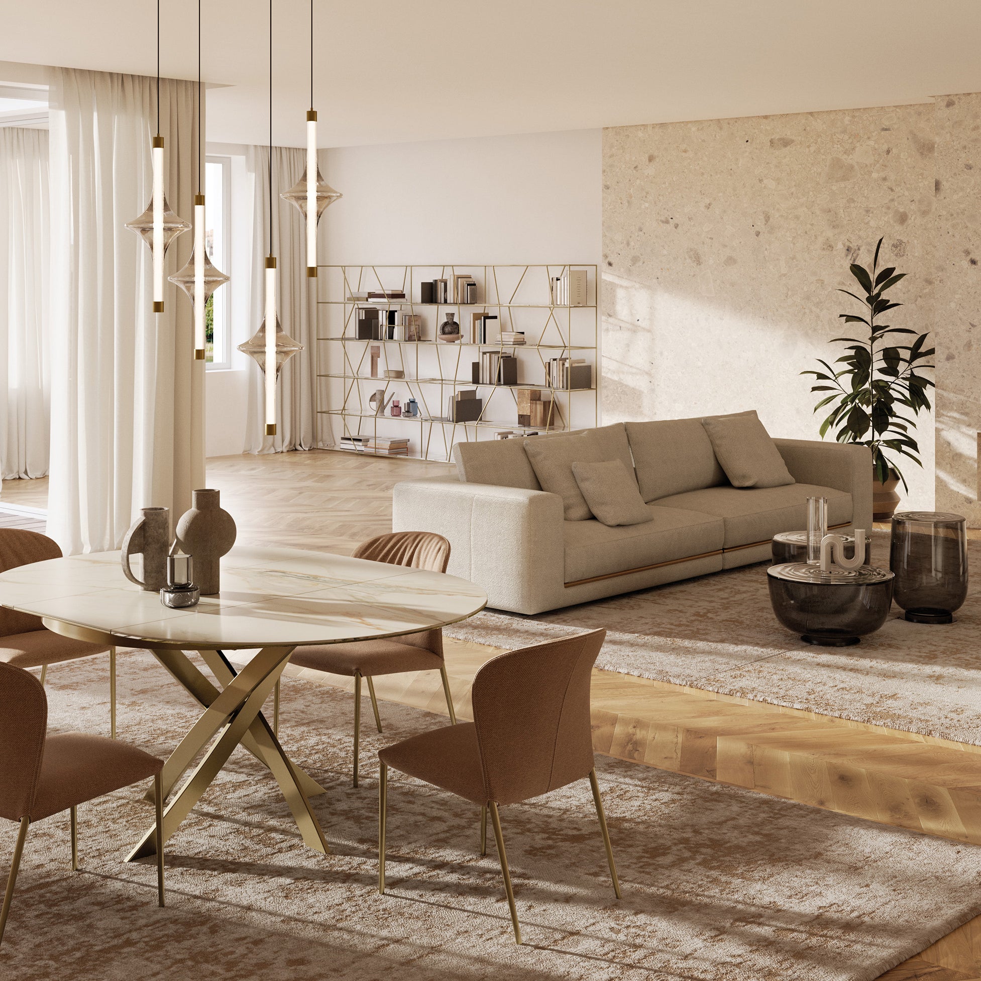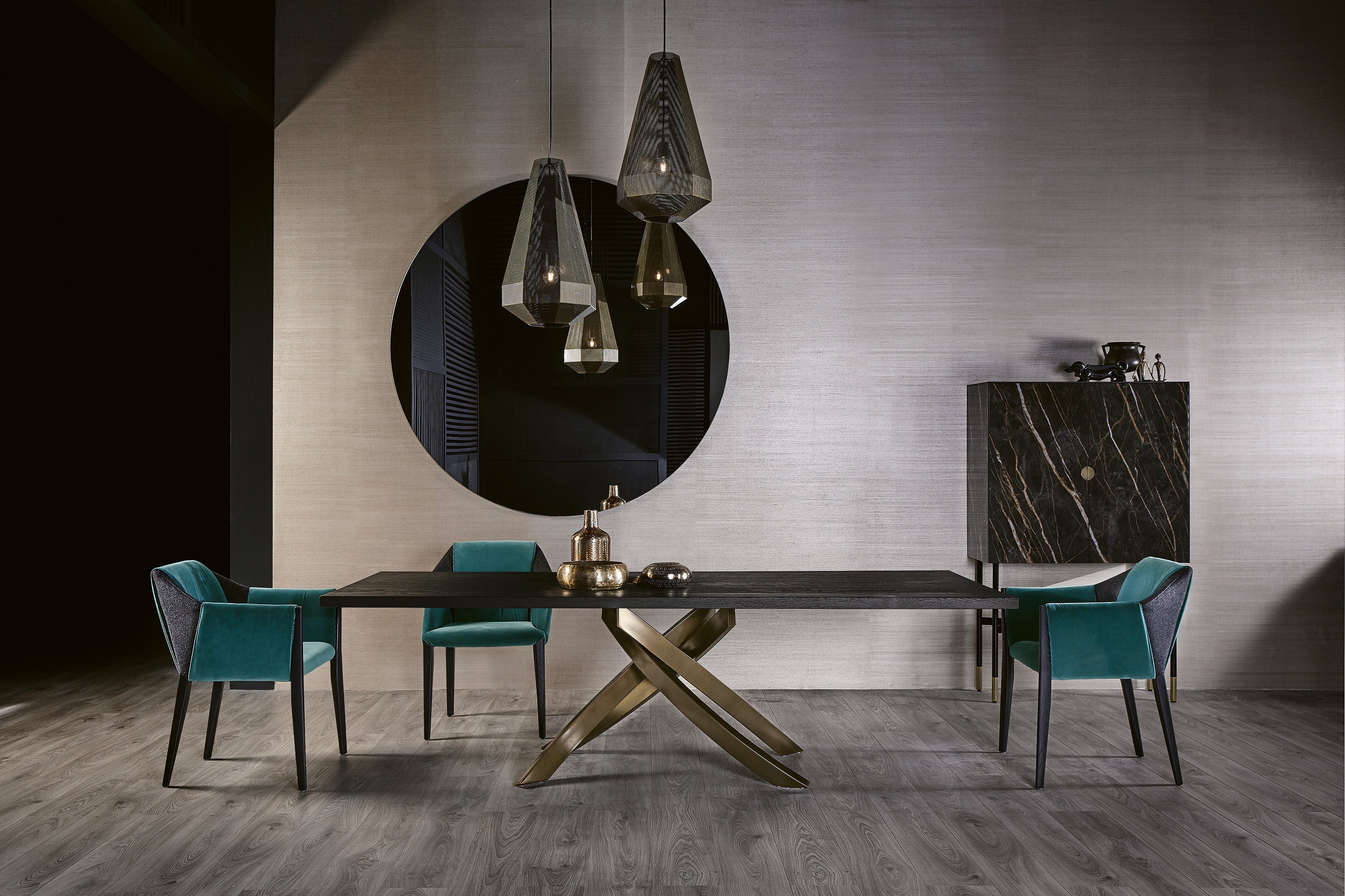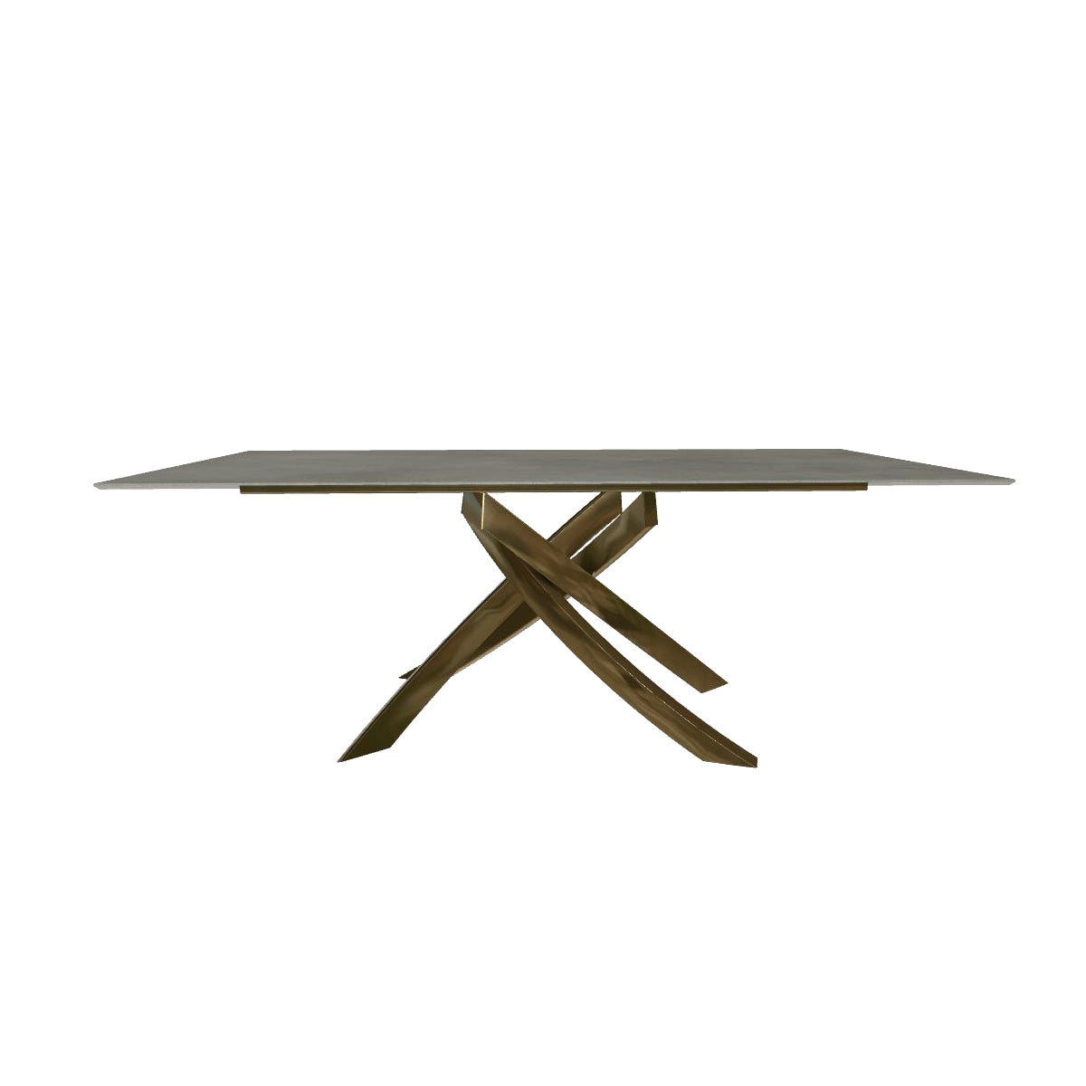The sculptural metal base is offered in a selection of finishes, including dark brass, aged brass, multicolour elegant, and natural silver, reinforcing its identity as a contemporary Italian luxury dining table with accessible elegance.