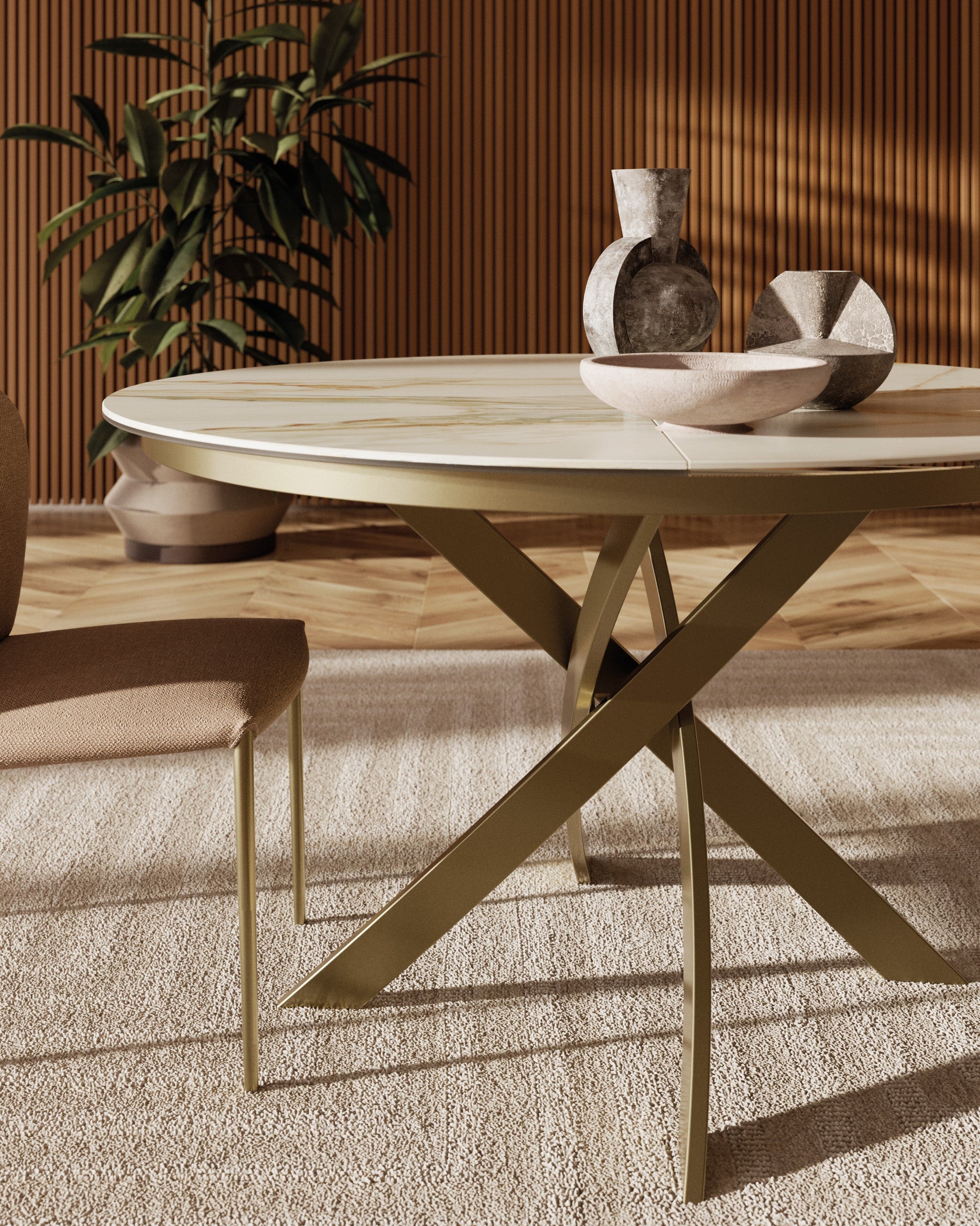 The table is supported by a sculptural metal base offered in a range of finishes, including dark brass, aged brass, multicolour elegant, and natural silver, reinforcing its identity as an accessible Italian luxury dining table.