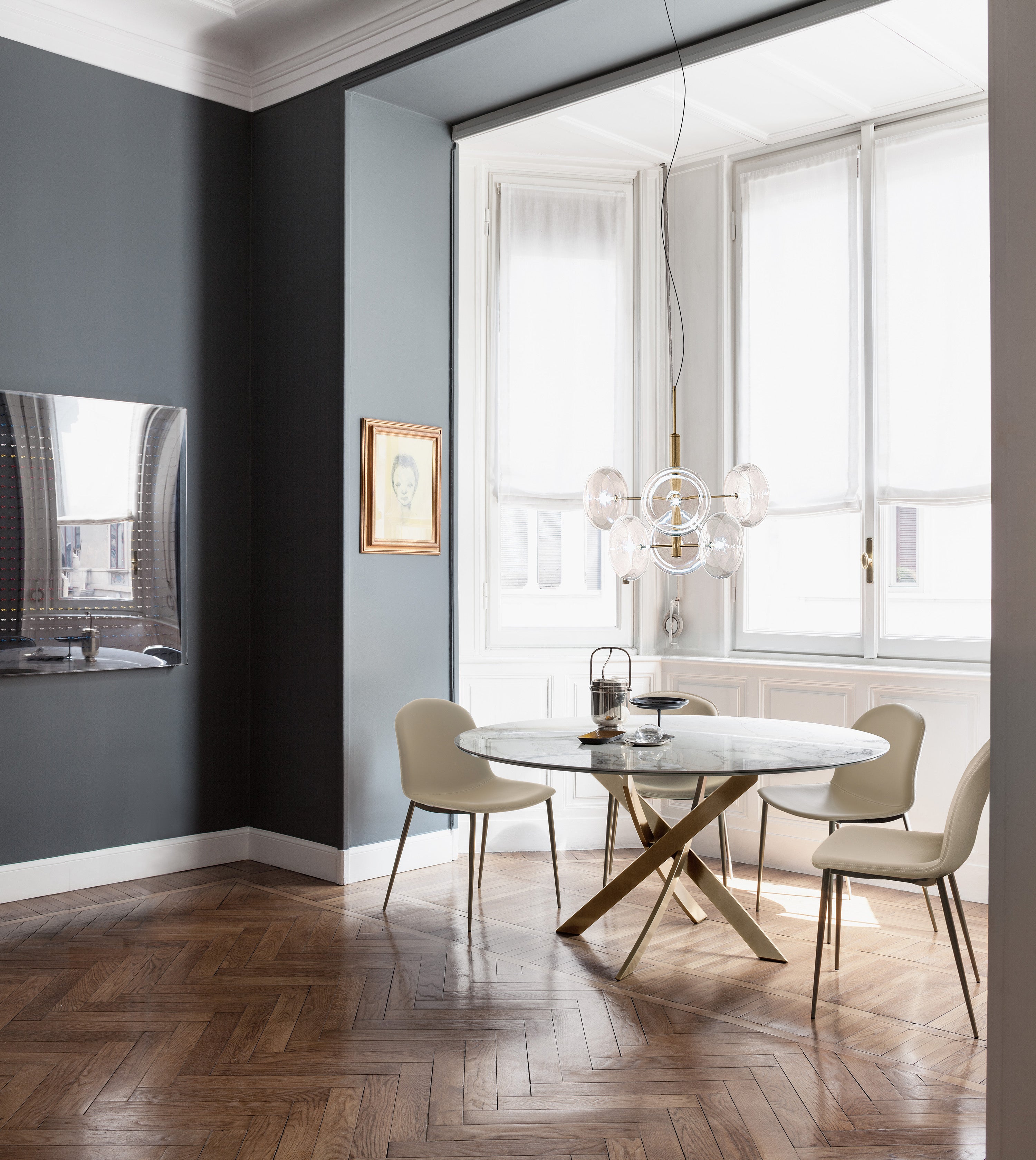 The round tabletop is available in veneer, SuperMarble, or velvet anti-scratch glass finishes, offering durability and elegance while reflecting contemporary Italian design sensibilities. An inbuilt Lazy Susan is available, discreetly integrated to enhance functionality without compromising the table’s refined proportions.