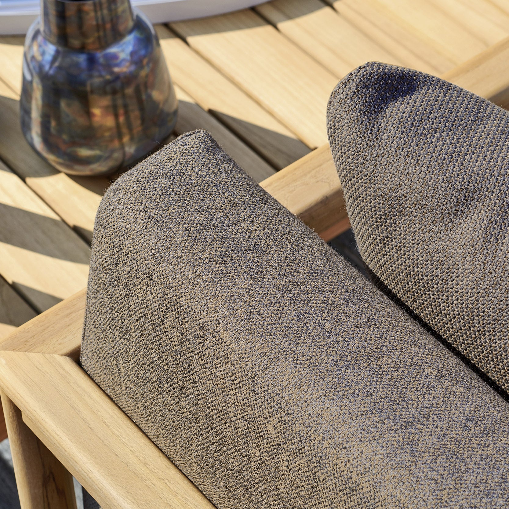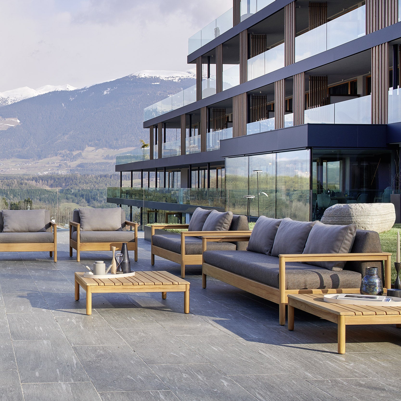 Its design stands out for the irregular arrangement of the teak wood slats of the top, which create an elegant and dynamic “barcode” effect.