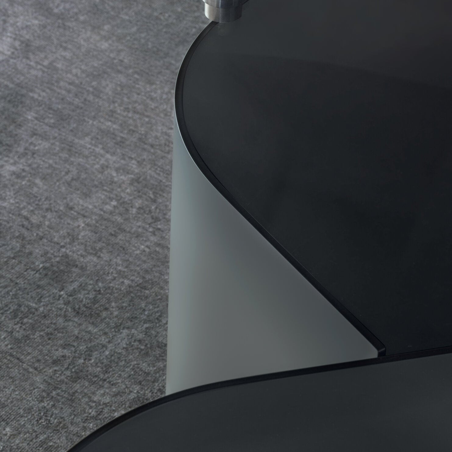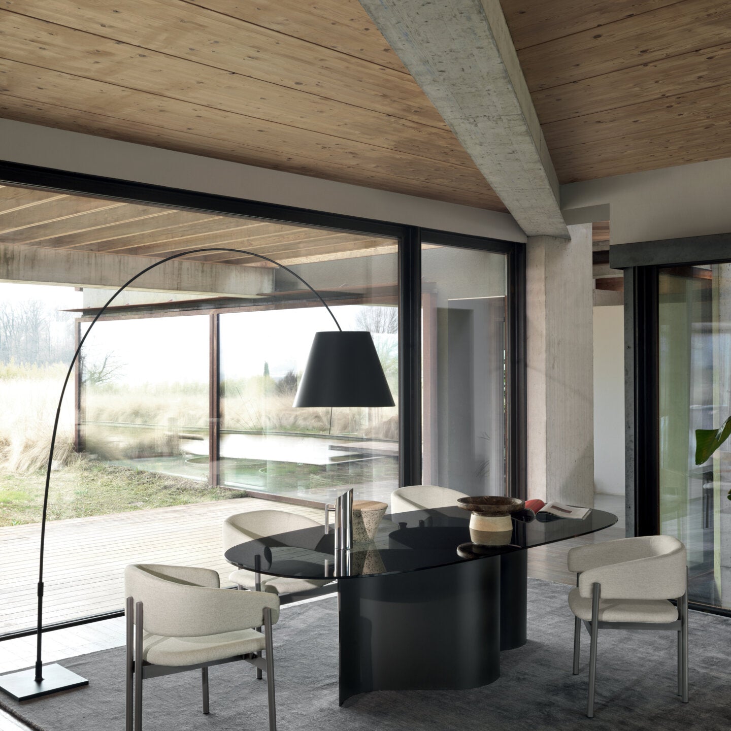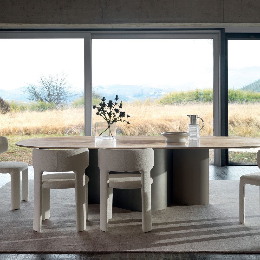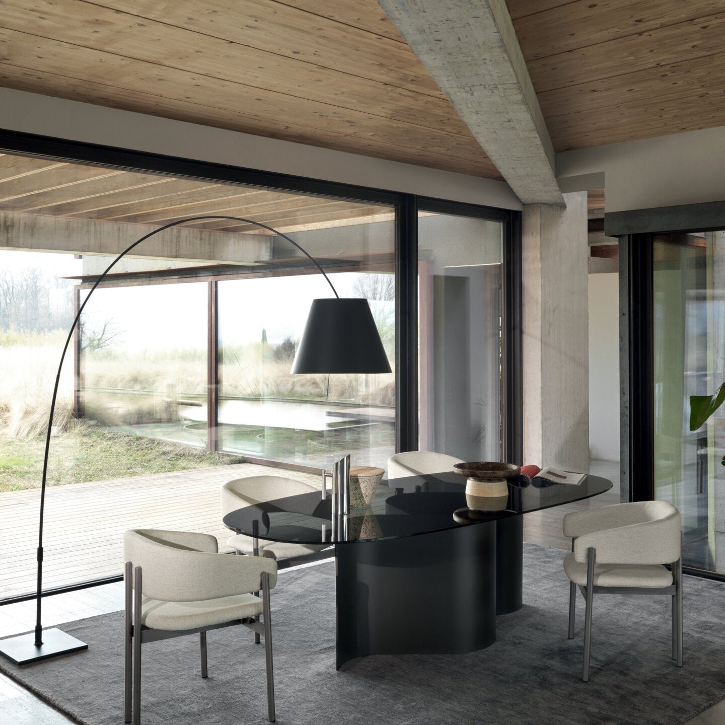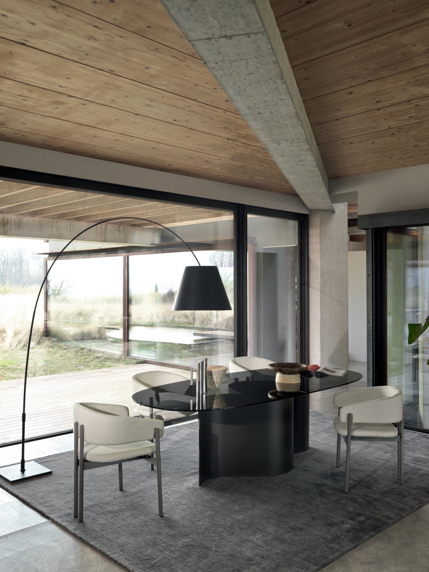 Choose from a selection of high-end finishes including marble, timber, lacquered wood, and glass table tops, with the sculptural base offered in anthracite, silk grey, or pewter.