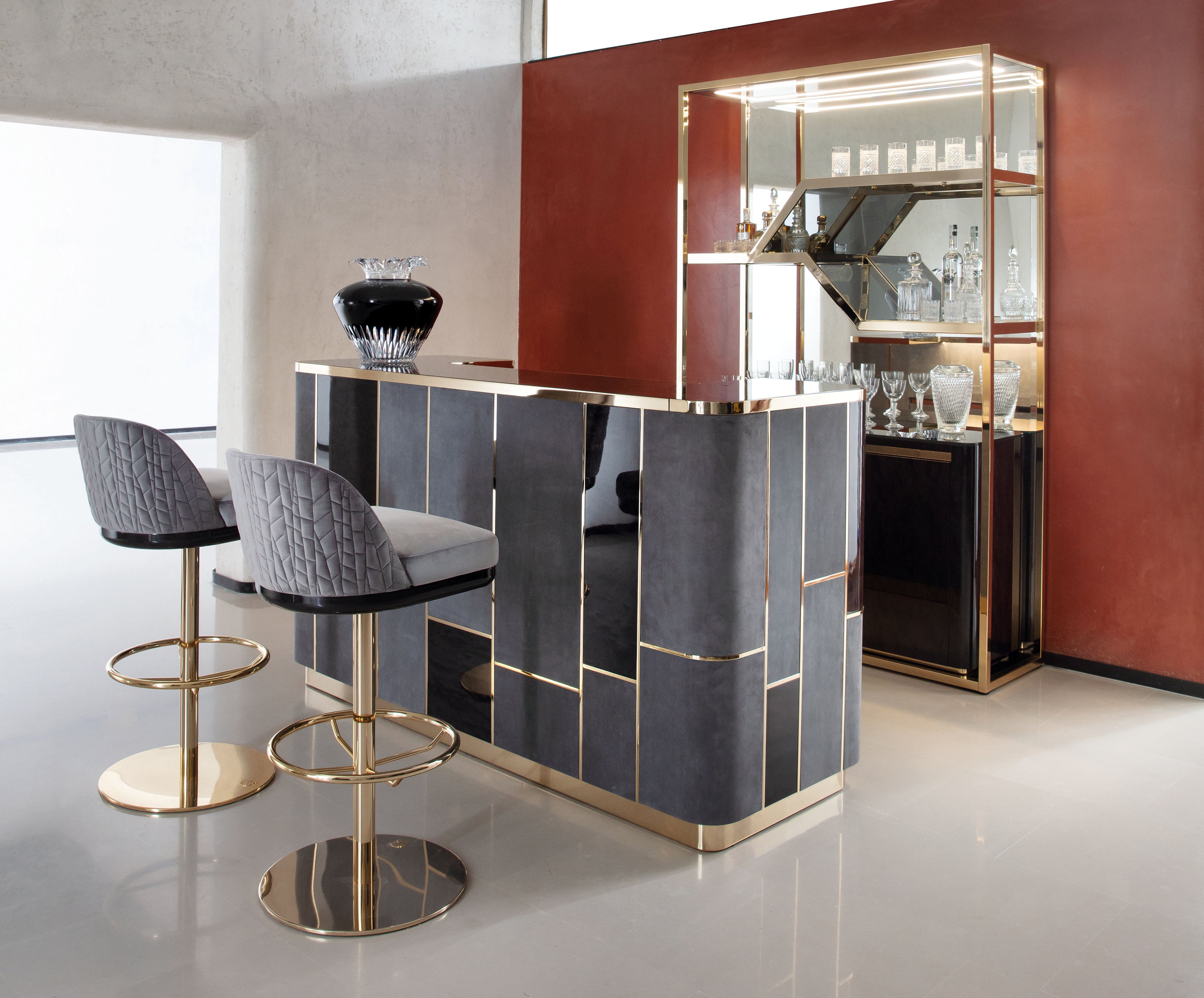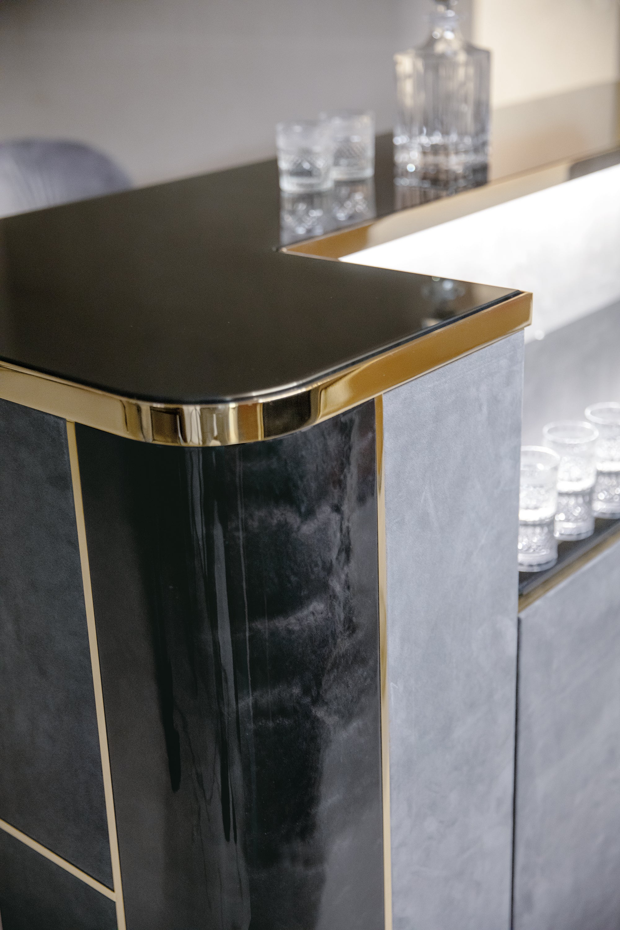Bar with fronts in combination of Black Bubinga burl veneer with high gloss polyester finish and grey nubuk color nr 6. Details and base in light gold chrome stainless steel. Tops in smoked tempered glass.