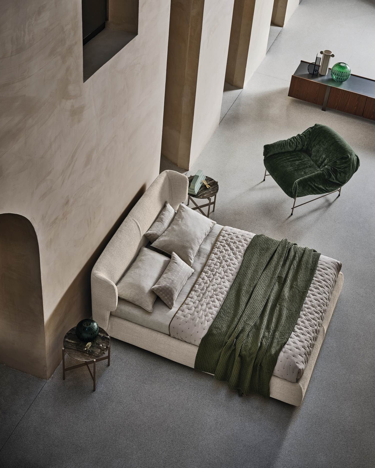 Just like the elegant armchair it is inspired by, this bed’s headboard steals the show as a single, wraparound structure.