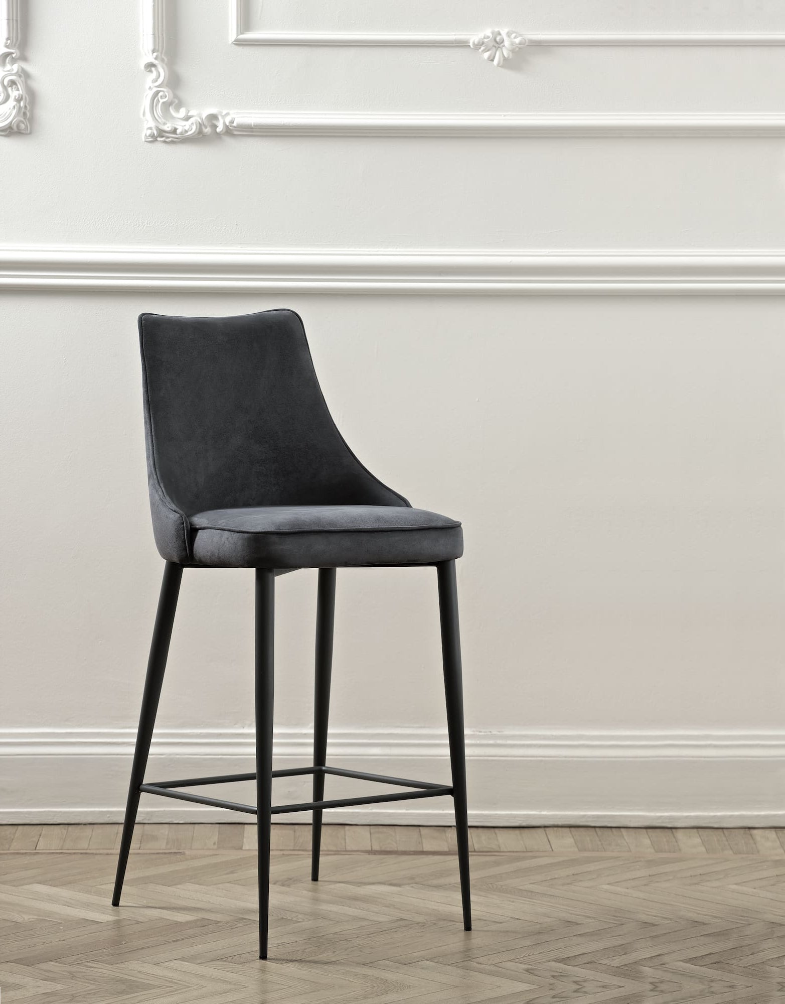 Bar chair with lacquered metal frame, seat and back upholstered and covered. Piping can be matching colour or contrast.