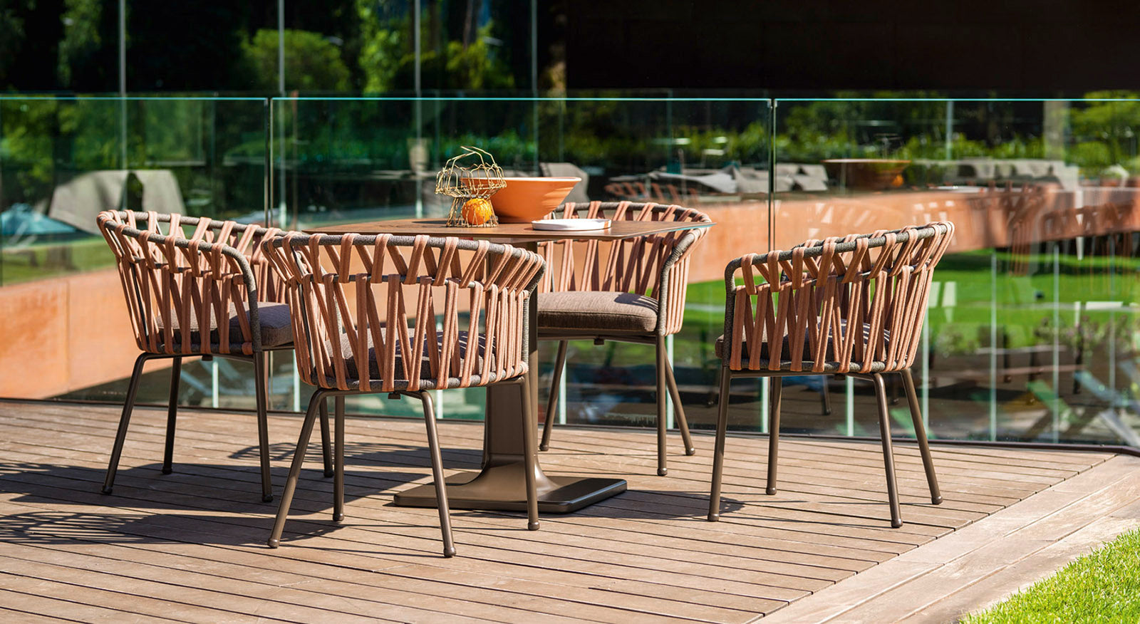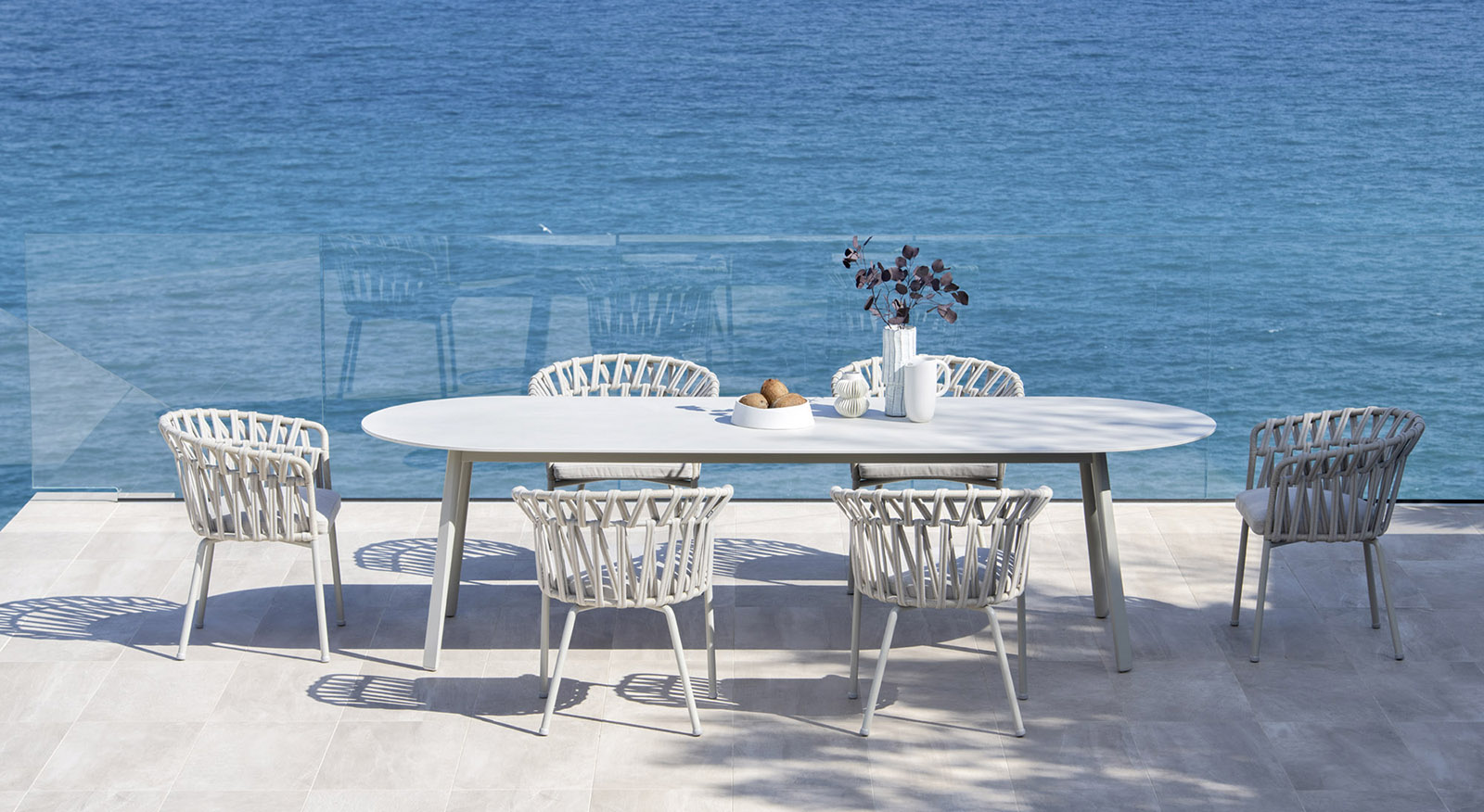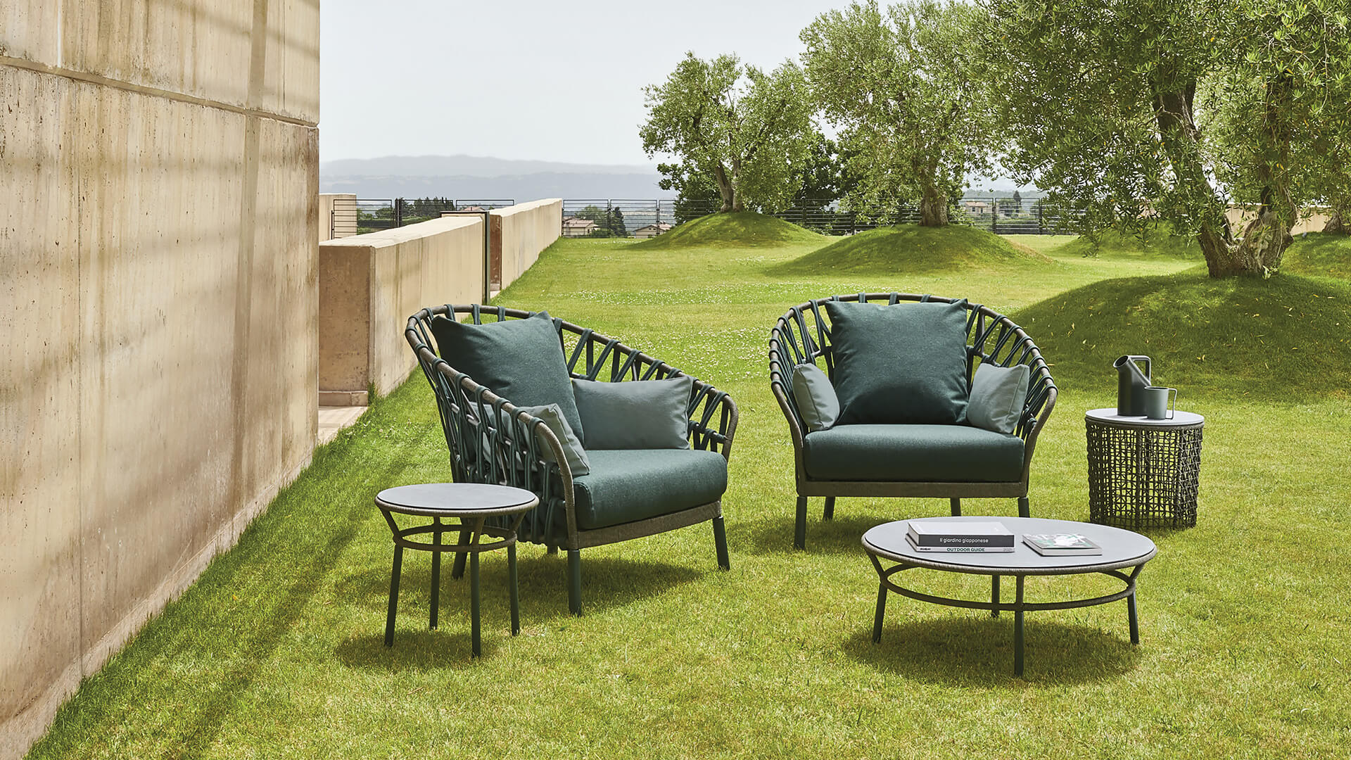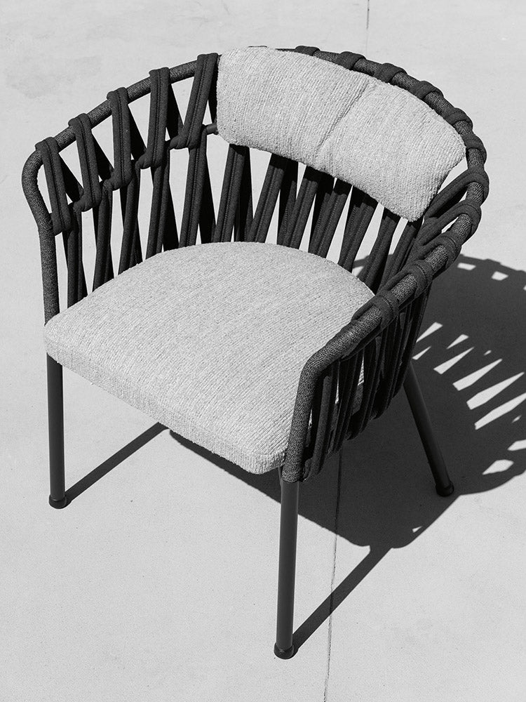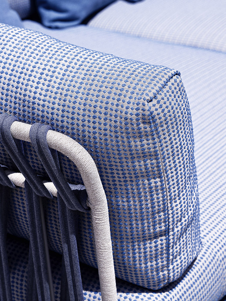Lines inspired by the corolla of a flower and the collar of a shirt, marked by the interlacing, refined essential in acrylic fabric band. The slender, powder-coated aluminium structure combines lightness and robustness. Completing the recipe of perfect relaxation outdoor are seat and optional back cushion in fabric, padded with rubber Dryfeel® for outdoor use.